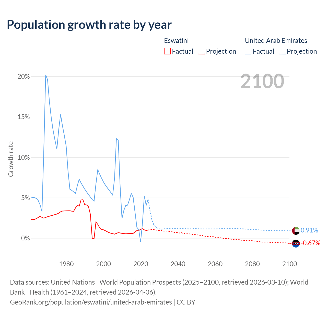 - For the last 10 years, Eswatini has had an average growth rate of +0.87% per year vs +3.31% in the United Arab Emirates.