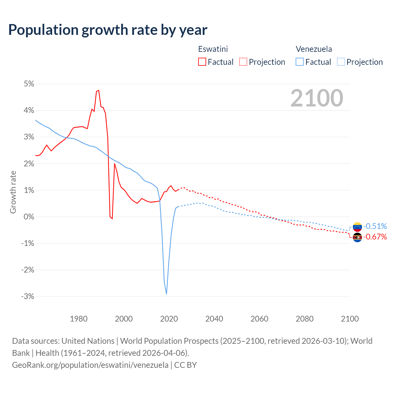 - For the last 10 years, Eswatini has had an average growth rate of +0.87% per year vs -0.46% in Venezuela.