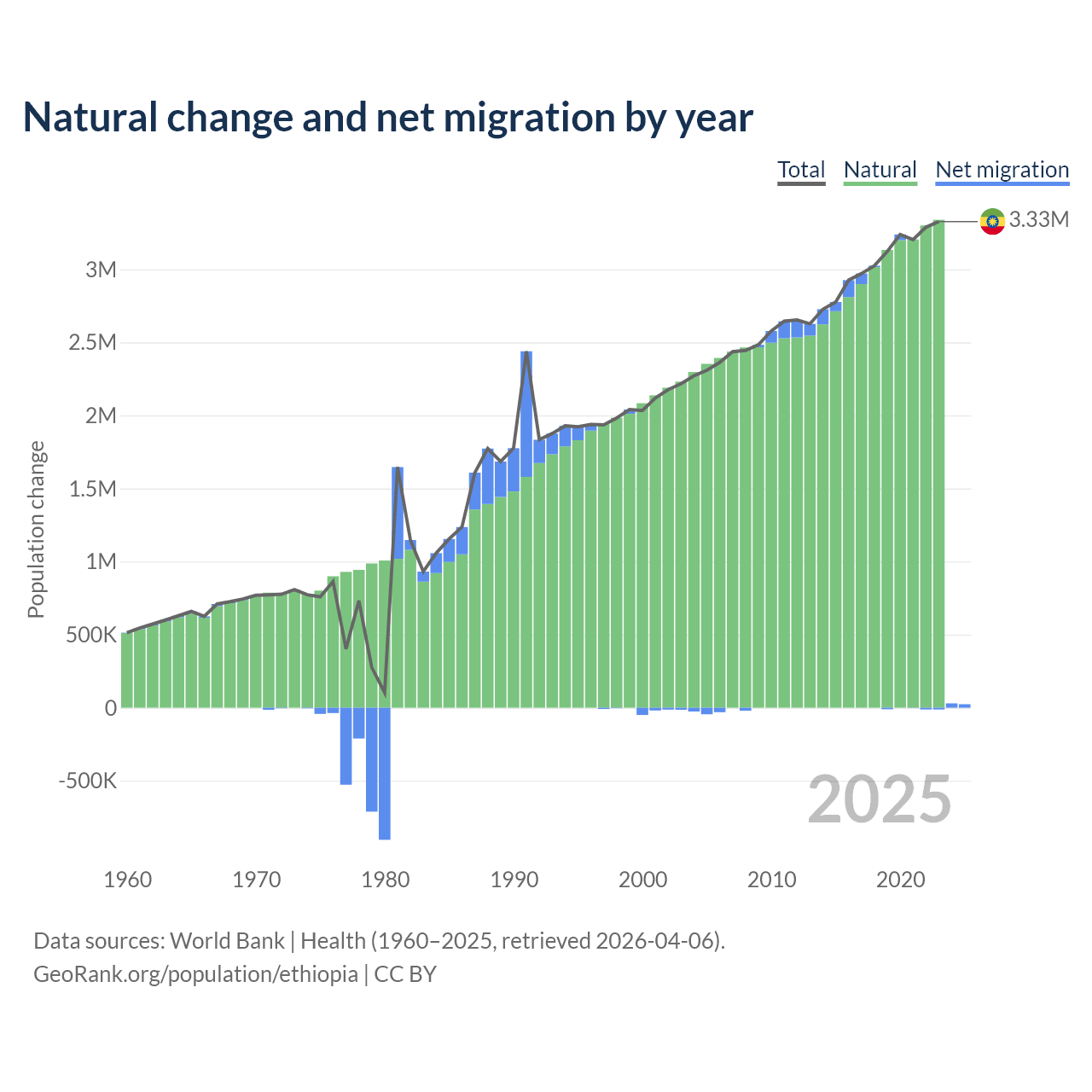 Over the last 10 years, 98.8% of the population change in Ethiopia is from natural causes (a gain of 30,237,373 people) and 1.19% is from migration (a gain of 365,488 people).