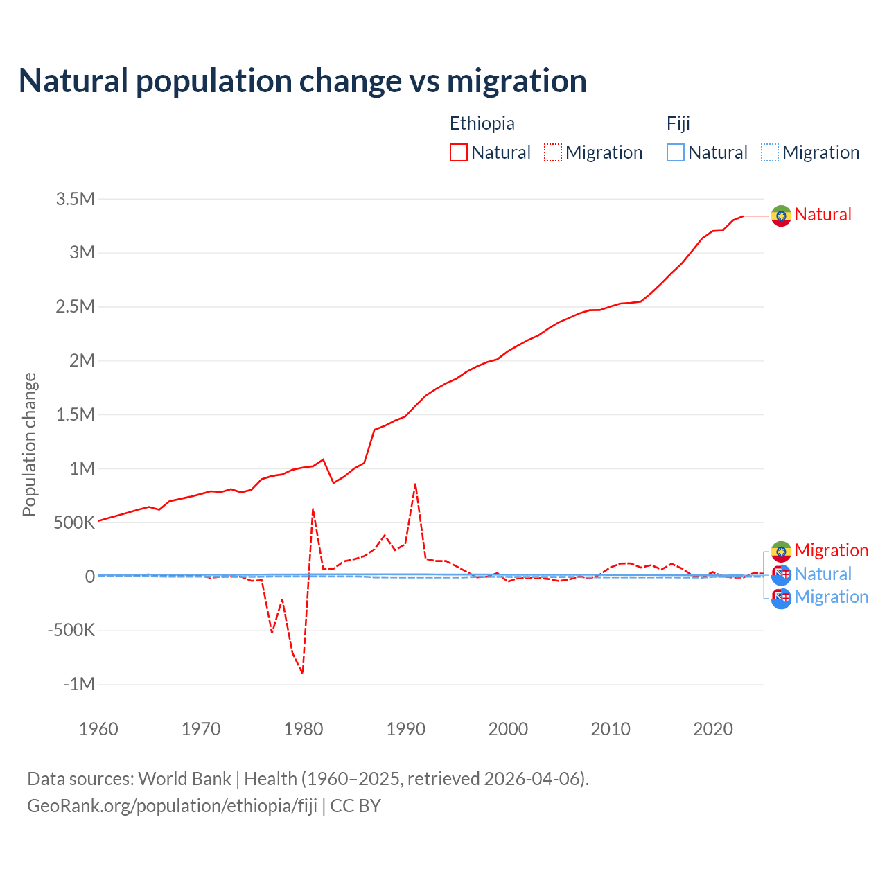 Over the last 10 years, 98.8% of the population change in Ethiopia is from natural causes (a gain of 30,237,373 people) and 1.19% is from migration (a gain of 365,488 people). In Fiji 52.6% is from natural causes (a gain of 94,971 people) and 47.4% is from migration (a loss of 85,415 people).