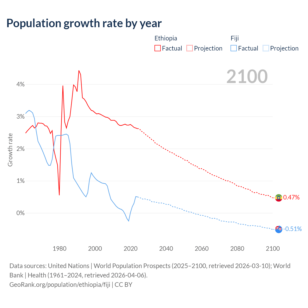 - For the last 10 years, Ethiopia has had an average growth rate of +2.71% per year vs +0.12% in Fiji.