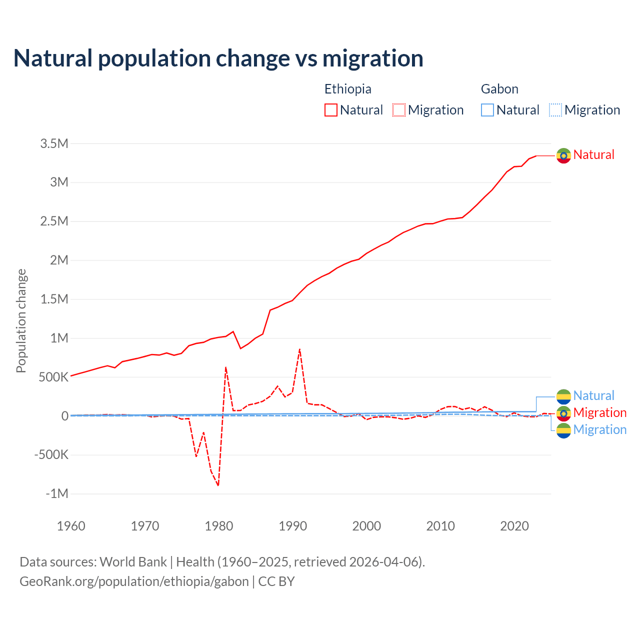 Over the last 10 years, 98.8% of the population change in Ethiopia is from natural causes (a gain of 30,237,373 people) and 1.19% is from migration (a gain of 365,488 people). In Gabon 91.1% is from natural causes (a gain of 515,484 people) and 8.86% is from migration (a gain of 50,119 people).