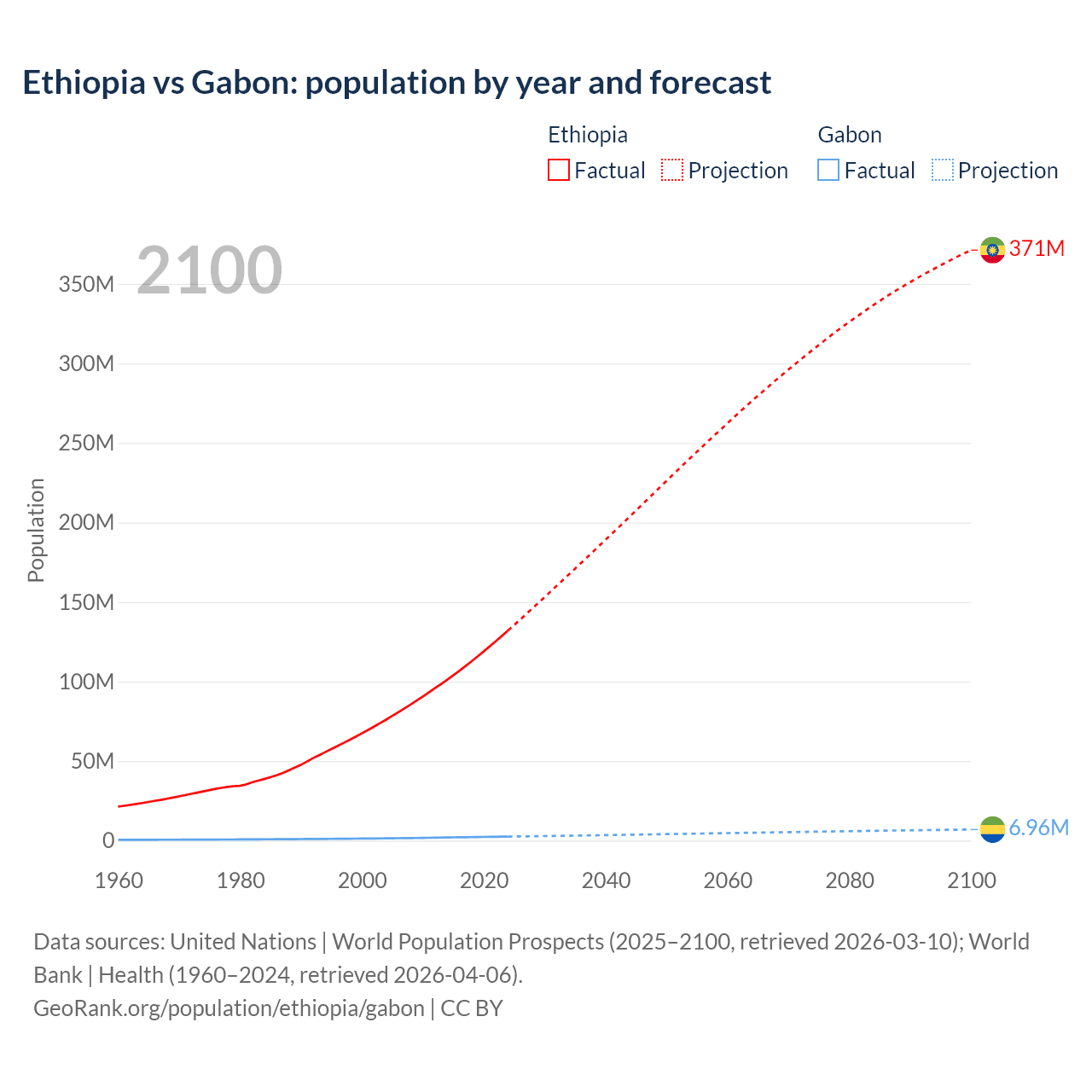 The latest officially reported population of Ethiopia was 132,059,767 in 2024 vs 2,538,952 people in Gabon in 2024. In 2026, based on the adjusted UN estimation, the current Ethiopia's population is 139,917,664 people compared to 2,663,339 in Gabon.