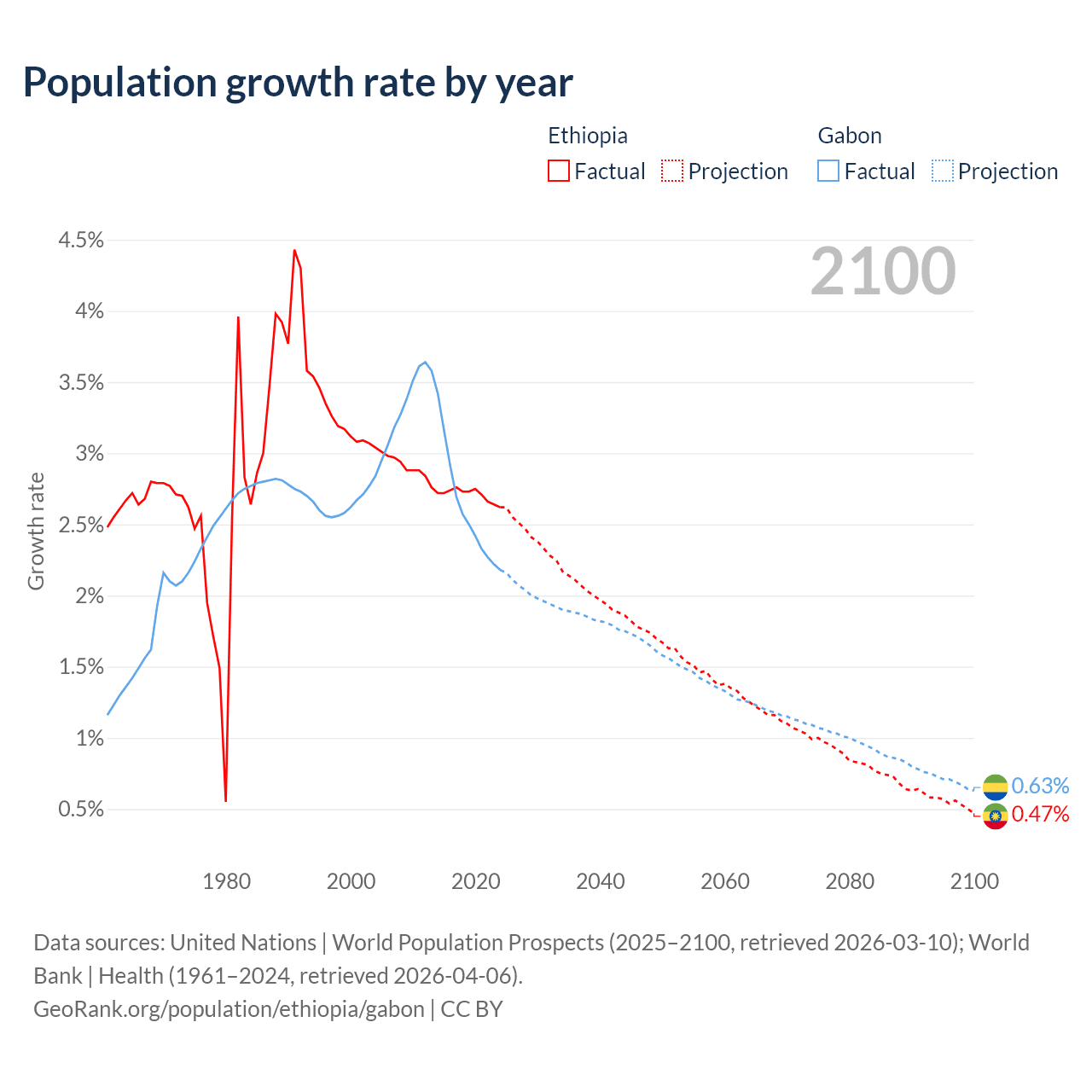 - For the last 10 years, Ethiopia has had an average growth rate of +2.71% per year vs +2.61% in Gabon.