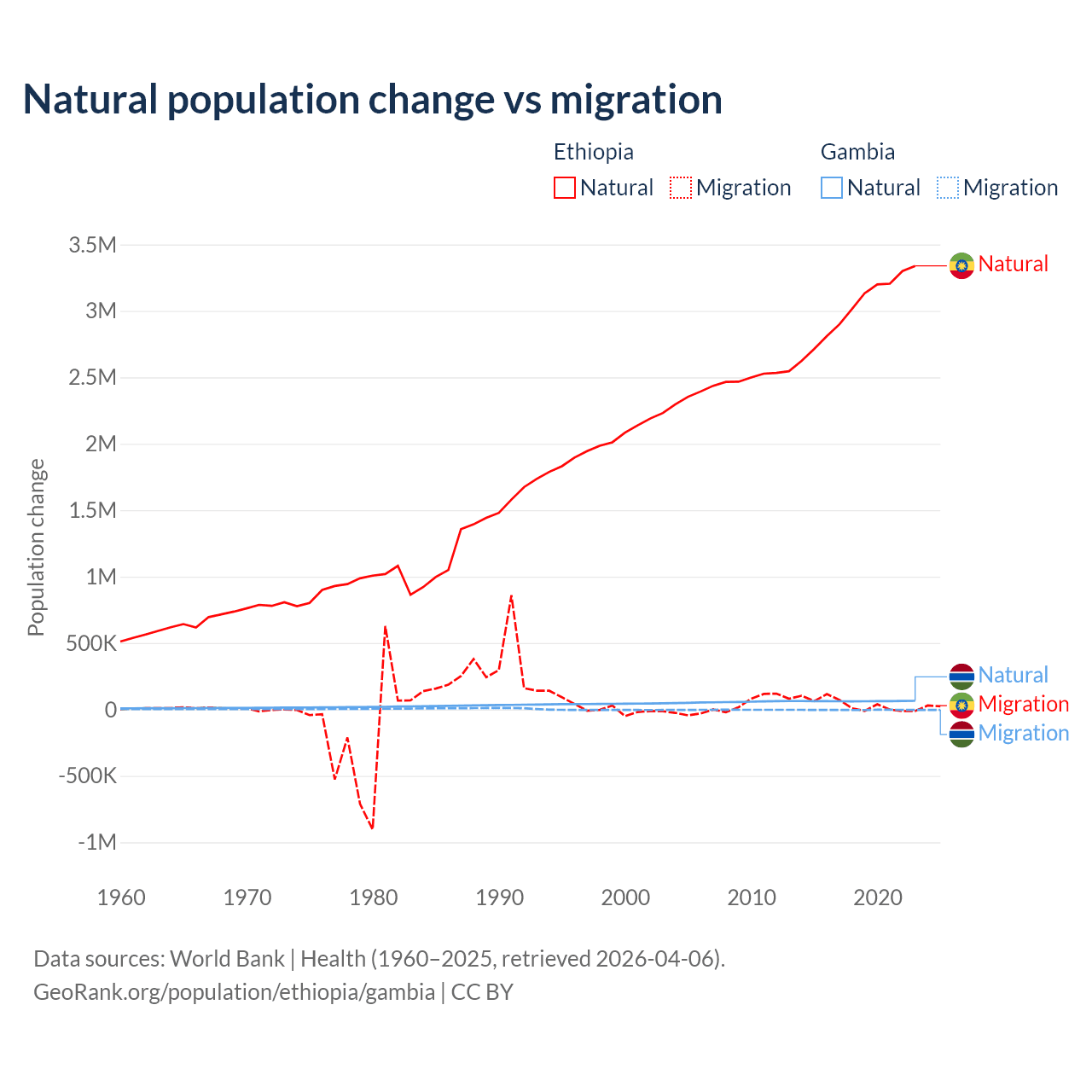 Over the last 10 years, 98.8% of the population change in Ethiopia is from natural causes (a gain of 30,237,373 people) and 1.19% is from migration (a gain of 365,488 people). In the Gambia 95.2% is from natural causes (a gain of 625,795 people) and 4.75% is from migration (a loss of 31,227 people).