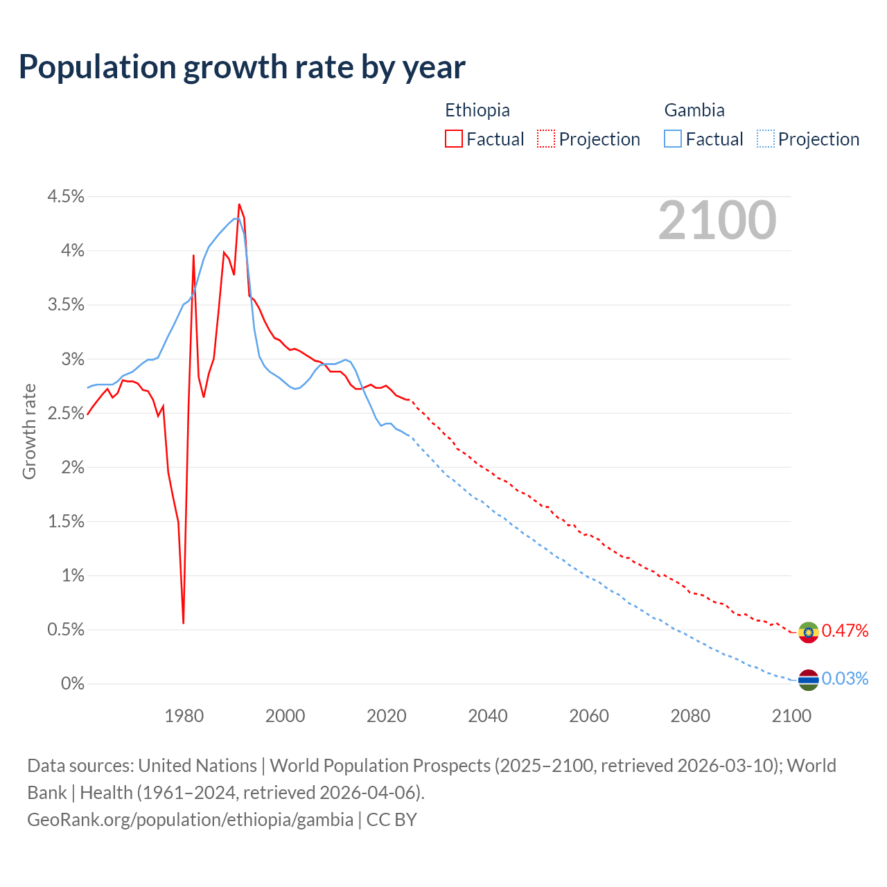 - For the last 10 years, Ethiopia has had an average growth rate of +2.71% per year vs +2.5% in the Gambia.