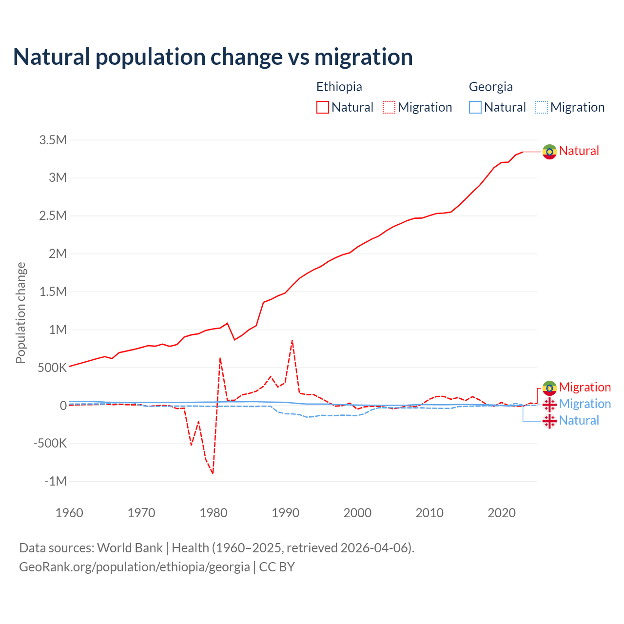 Over the last 10 years, 98.8% of the population change in Ethiopia is from natural causes (a gain of 30,237,373 people) and 1.19% is from migration (a gain of 365,488 people). In Georgia 57.7% is from natural causes (a gain of 47,646 people) and 42.3% is from migration (a loss of 34,907 people).