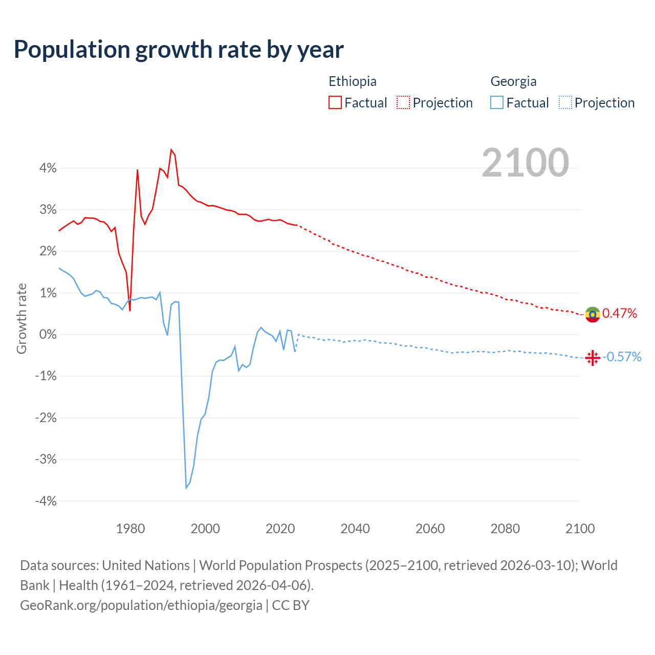 - For the last 10 years, Ethiopia has had an average growth rate of +2.71% per year vs -0.04% in Georgia.