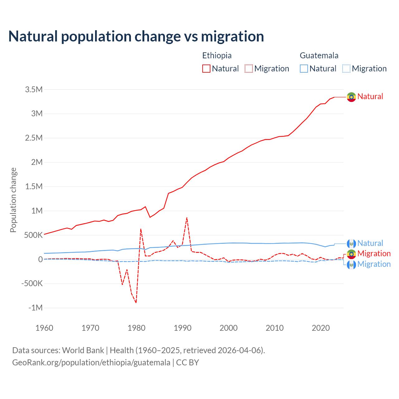 Over the last 10 years, 98.8% of the population change in Ethiopia is from natural causes (a gain of 30,237,373 people) and 1.19% is from migration (a gain of 365,488 people). In Guatemala 89.8% is from natural causes (a gain of 3,077,847 people) and 10.2% is from migration (a loss of 347,818 people).