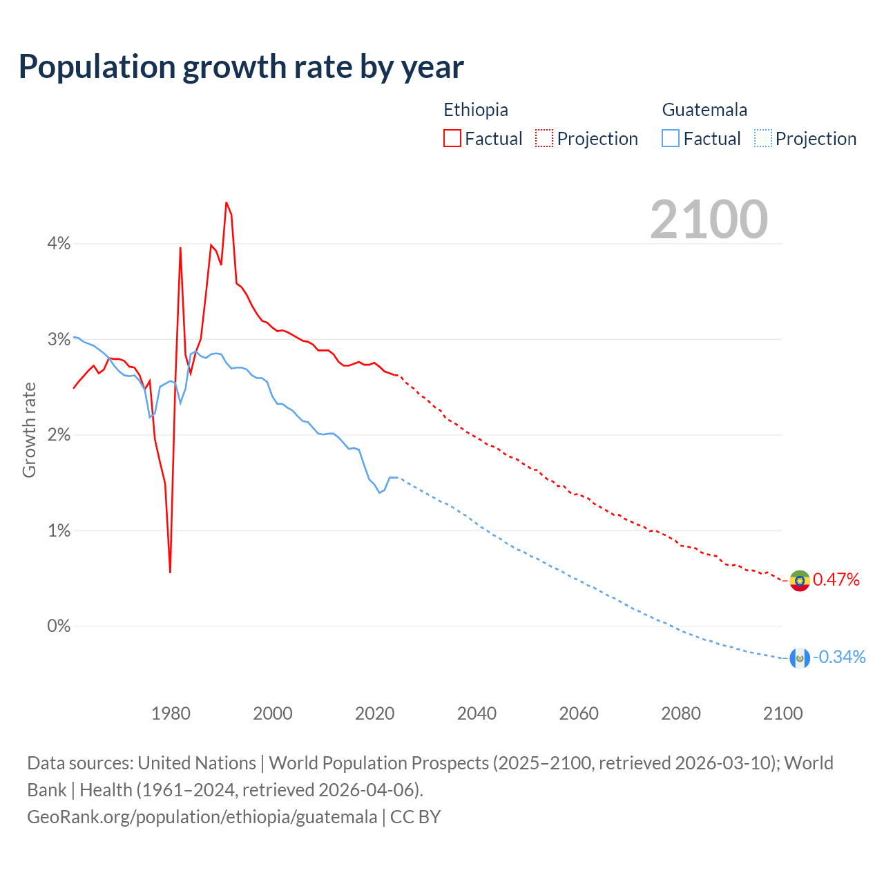 - For the last 10 years, Ethiopia has had an average growth rate of +2.71% per year vs +1.64% in Guatemala.
