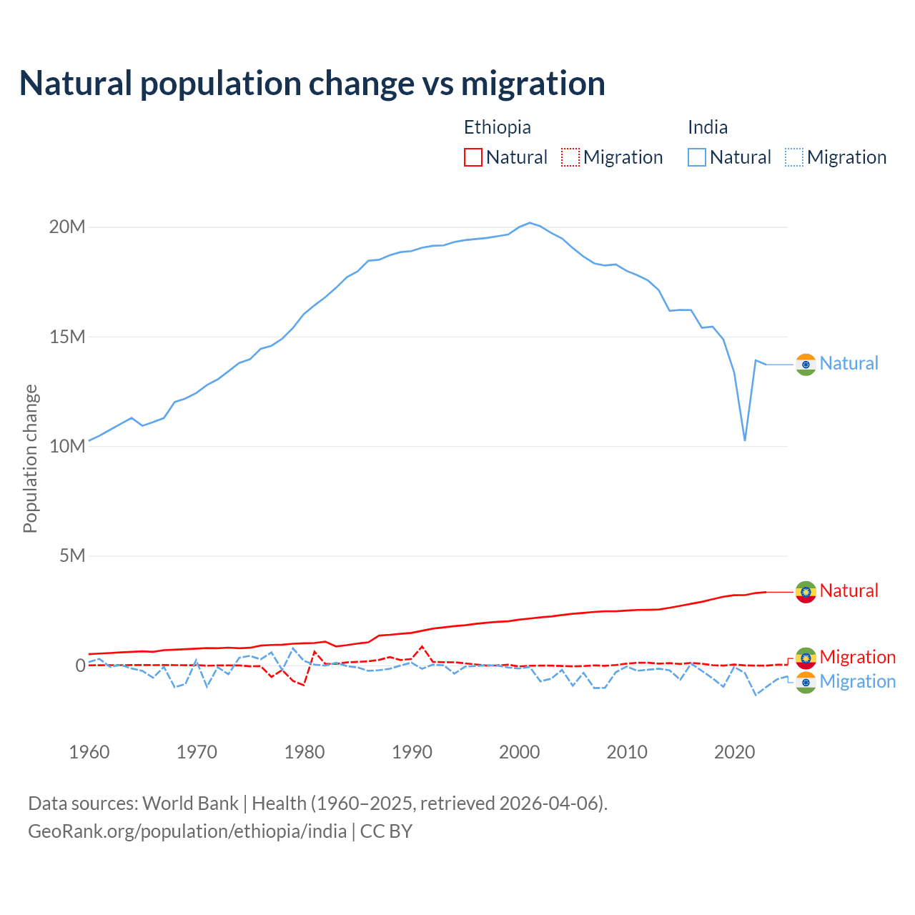 Over the last 10 years, 98.8% of the population change in Ethiopia is from natural causes (a gain of 30,237,373 people) and 1.19% is from migration (a gain of 365,488 people). In India 96.4% is from natural causes (a gain of 145,503,378 people) and 3.56% is from migration (a loss of 5,376,884 people).