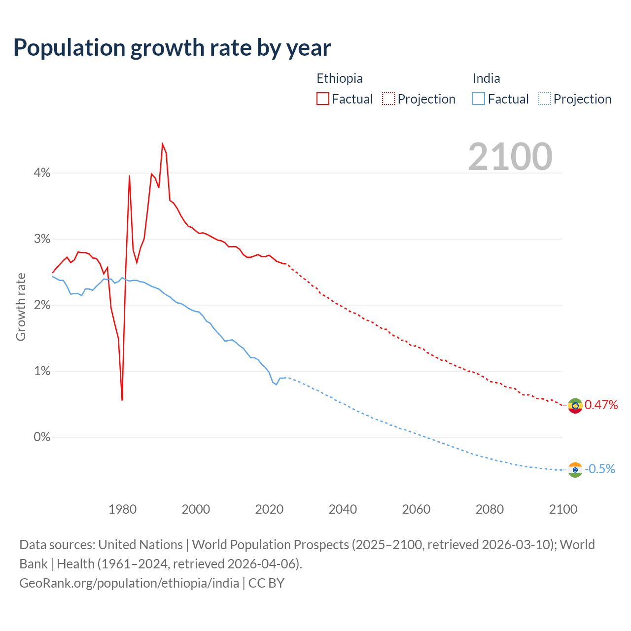 - For the last 10 years, Ethiopia has had an average growth rate of +2.71% per year vs +1.03% in India.