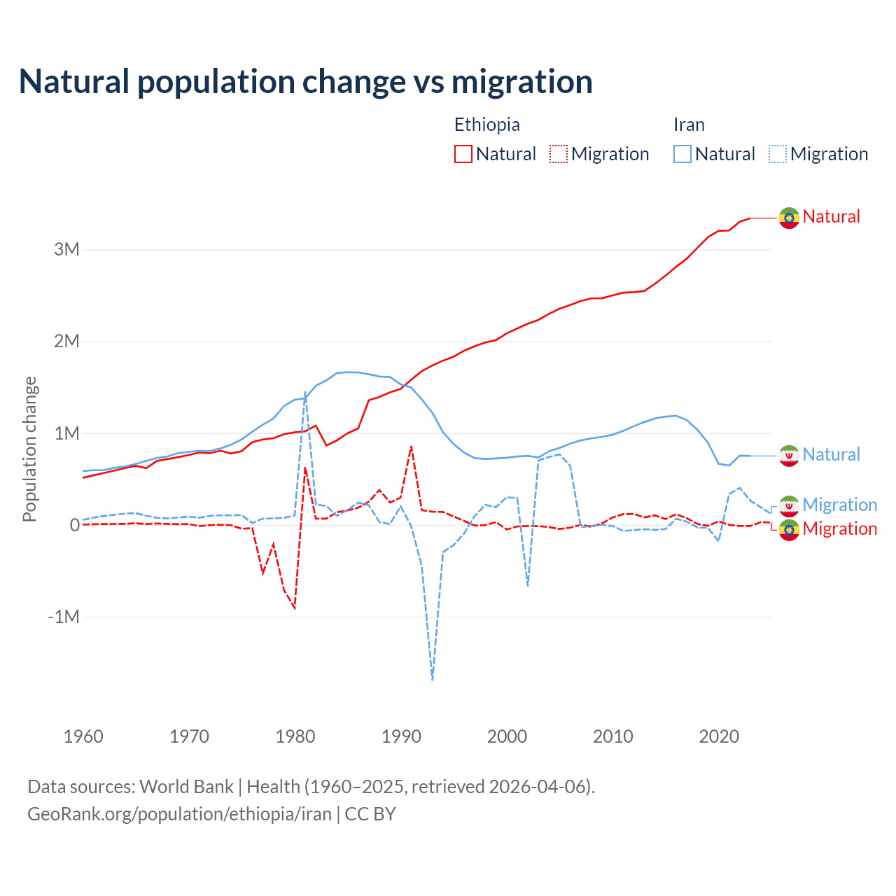 Over the last 10 years, 98.8% of the population change in Ethiopia is from natural causes (a gain of 30,237,373 people) and 1.19% is from migration (a gain of 365,488 people). In Iran 92.5% is from natural causes (a gain of 9,405,860 people) and 7.46% is from migration (a gain of 757,979 people).