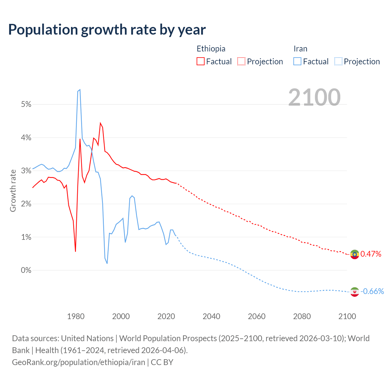 - For the last 10 years, Ethiopia has had an average growth rate of +2.71% per year vs +1.19% in Iran.