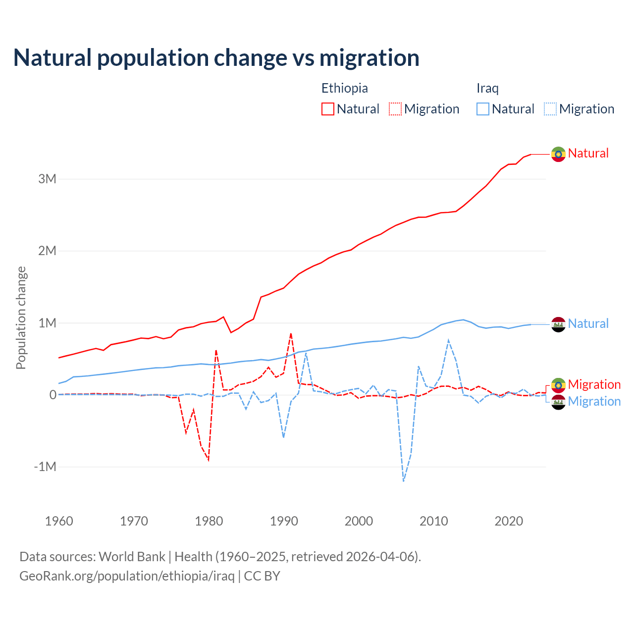 Over the last 10 years, 98.8% of the population change in Ethiopia is from natural causes (a gain of 30,237,373 people) and 1.19% is from migration (a gain of 365,488 people). In Iraq 99.2% is from natural causes (a gain of 9,598,842 people) and 0.76% is from migration (a loss of 73,050 people).