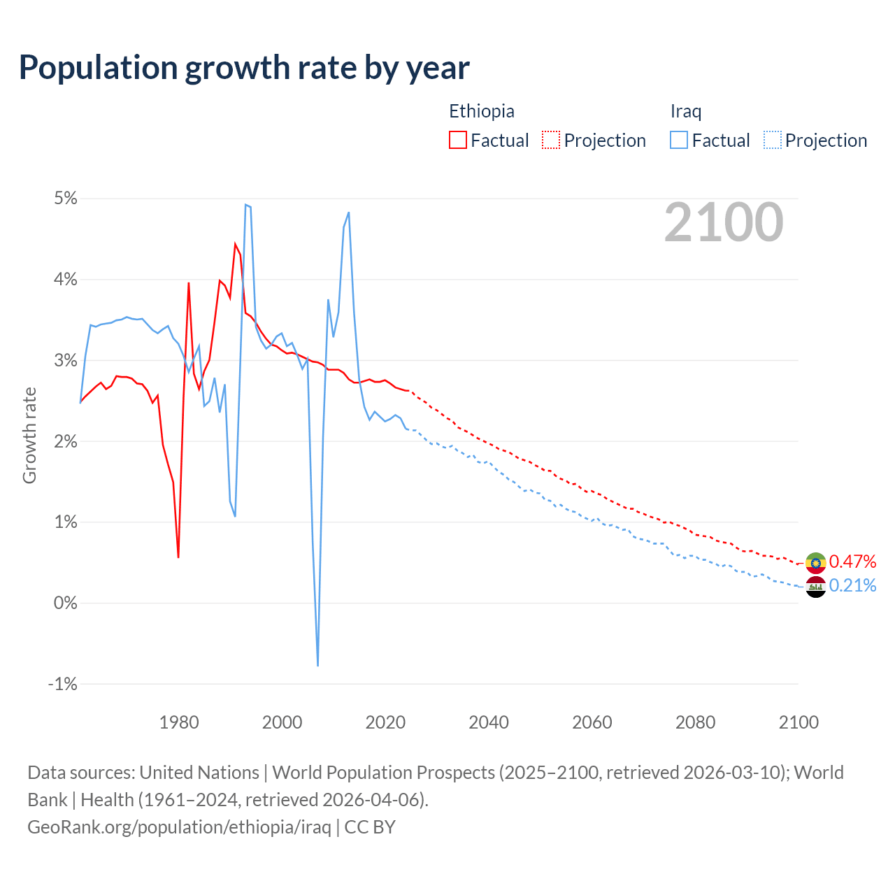 - For the last 10 years, Ethiopia has had an average growth rate of +2.71% per year vs +2.45% in Iraq.