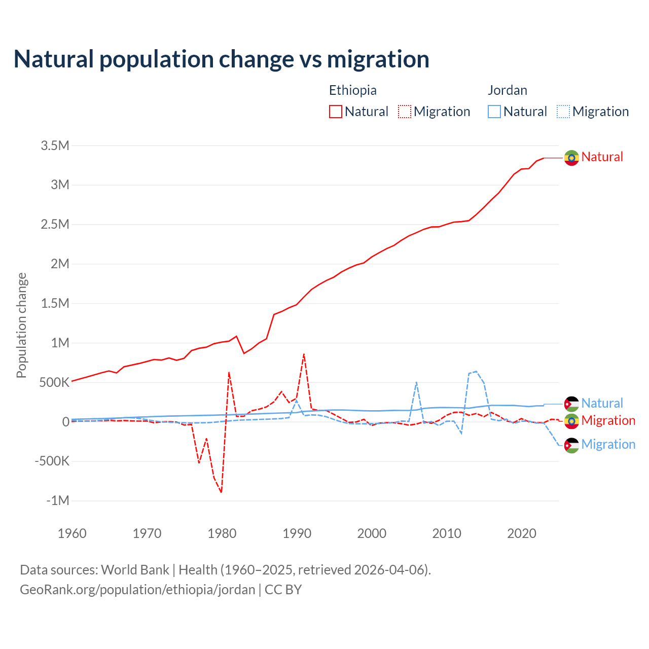 Over the last 10 years, 98.8% of the population change in Ethiopia is from natural causes (a gain of 30,237,373 people) and 1.19% is from migration (a gain of 365,488 people). In Jordan 63.2% is from natural causes (a gain of 1,991,452 people) and 36.8% is from migration (a gain of 1,157,625 people).