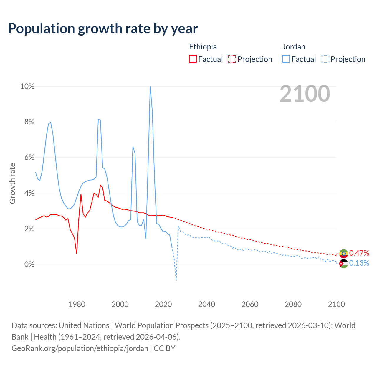 - For the last 10 years, Ethiopia has had an average growth rate of +2.71% per year vs +3.45% in Jordan.