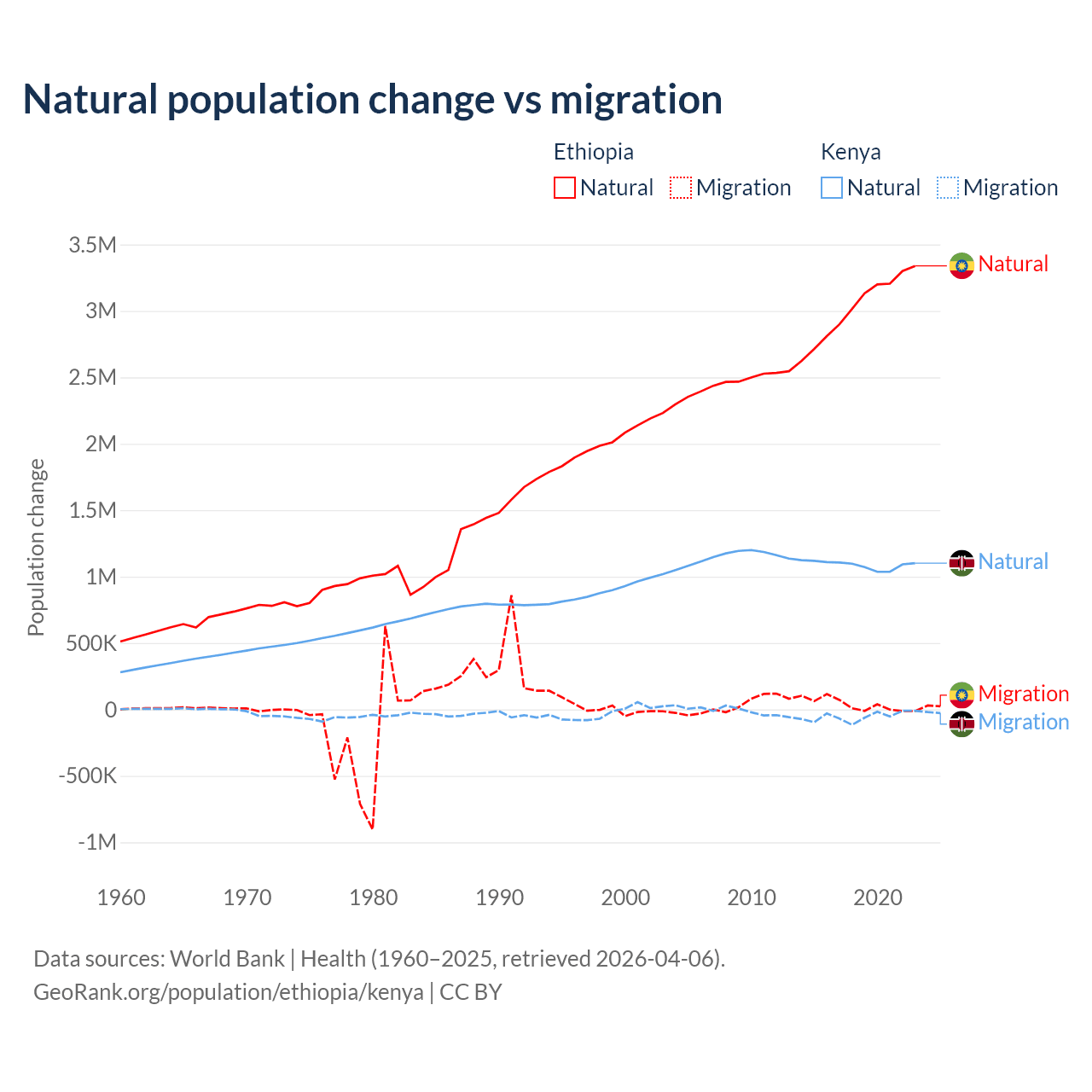 Over the last 10 years, 98.8% of the population change in Ethiopia is from natural causes (a gain of 30,237,373 people) and 1.19% is from migration (a gain of 365,488 people). In Kenya 95.3% is from natural causes (a gain of 10,892,362 people) and 4.67% is from migration (a loss of 533,876 people).