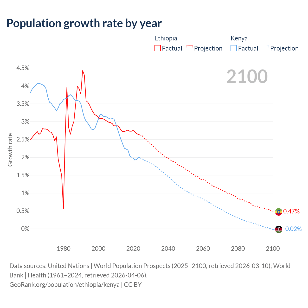 - For the last 10 years, Ethiopia has had an average growth rate of +2.71% per year vs +2.08% in Kenya.