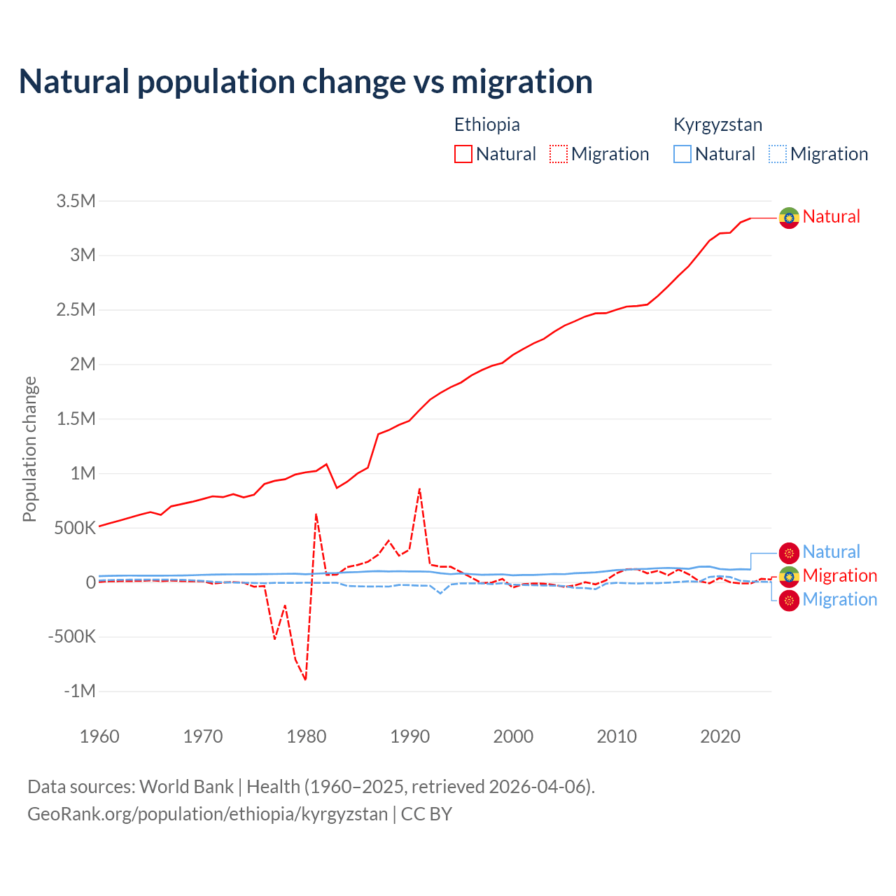 Over the last 10 years, 98.8% of the population change in Ethiopia is from natural causes (a gain of 30,237,373 people) and 1.19% is from migration (a gain of 365,488 people). In Kyrgyzstan 88.5% is from natural causes (a gain of 1,258,837 people) and 11.5% is from migration (a gain of 164,132 people).