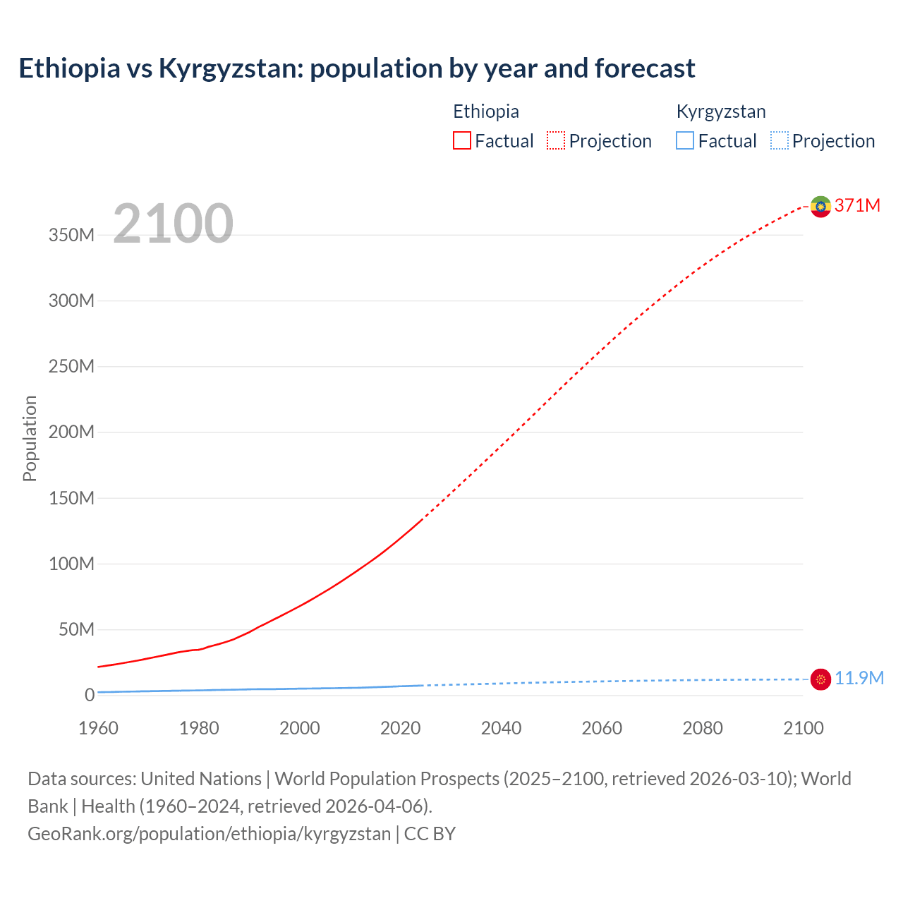 The latest officially reported population of Ethiopia was 132,059,767 in 2024 vs 7,221,868 people in Kyrgyzstan in 2024. In 2026, based on the adjusted UN estimation, the current Ethiopia's population is 139,917,664 people compared to 7,471,102 in Kyrgyzstan.