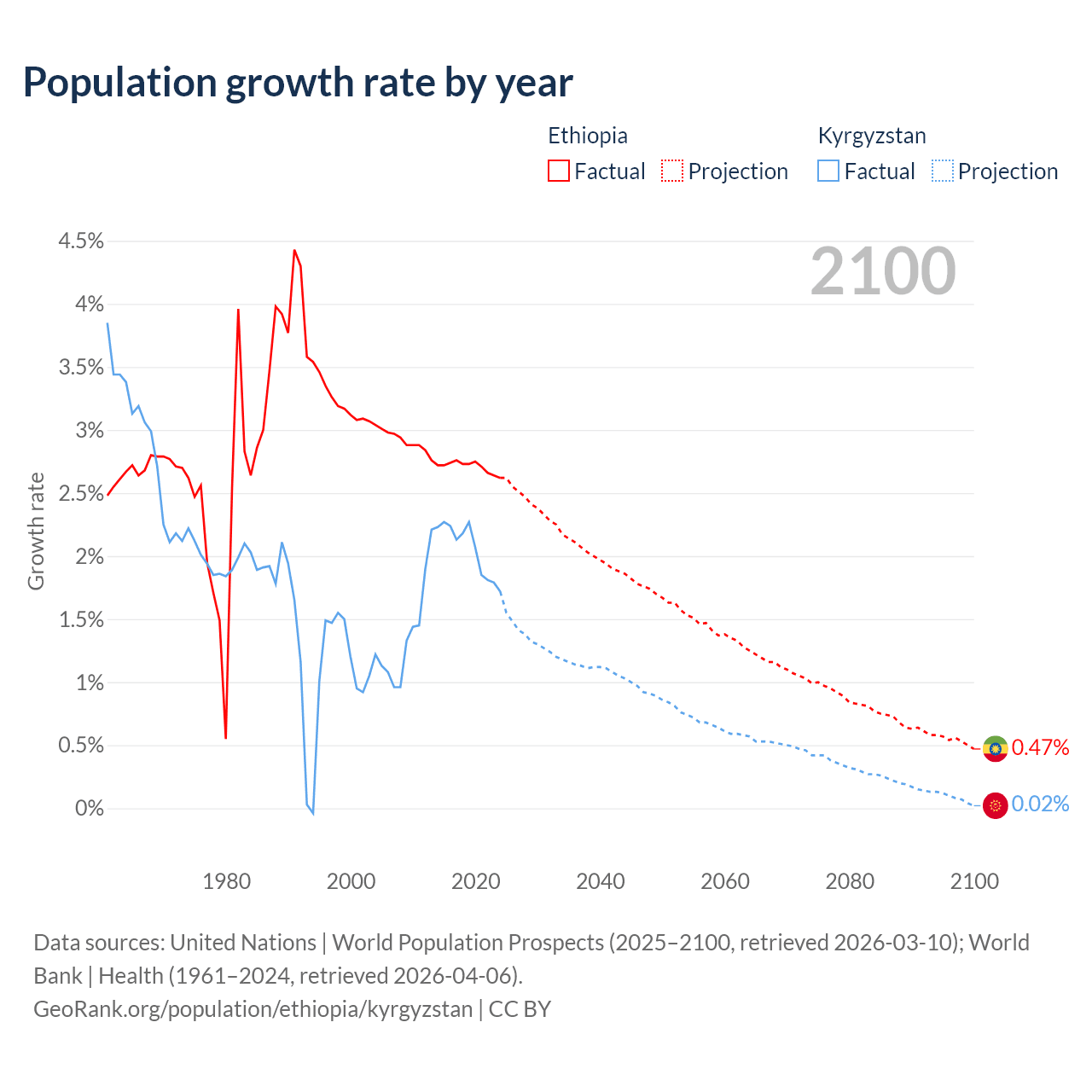 - For the last 10 years, Ethiopia has had an average growth rate of +2.71% per year vs +2.05% in Kyrgyzstan.