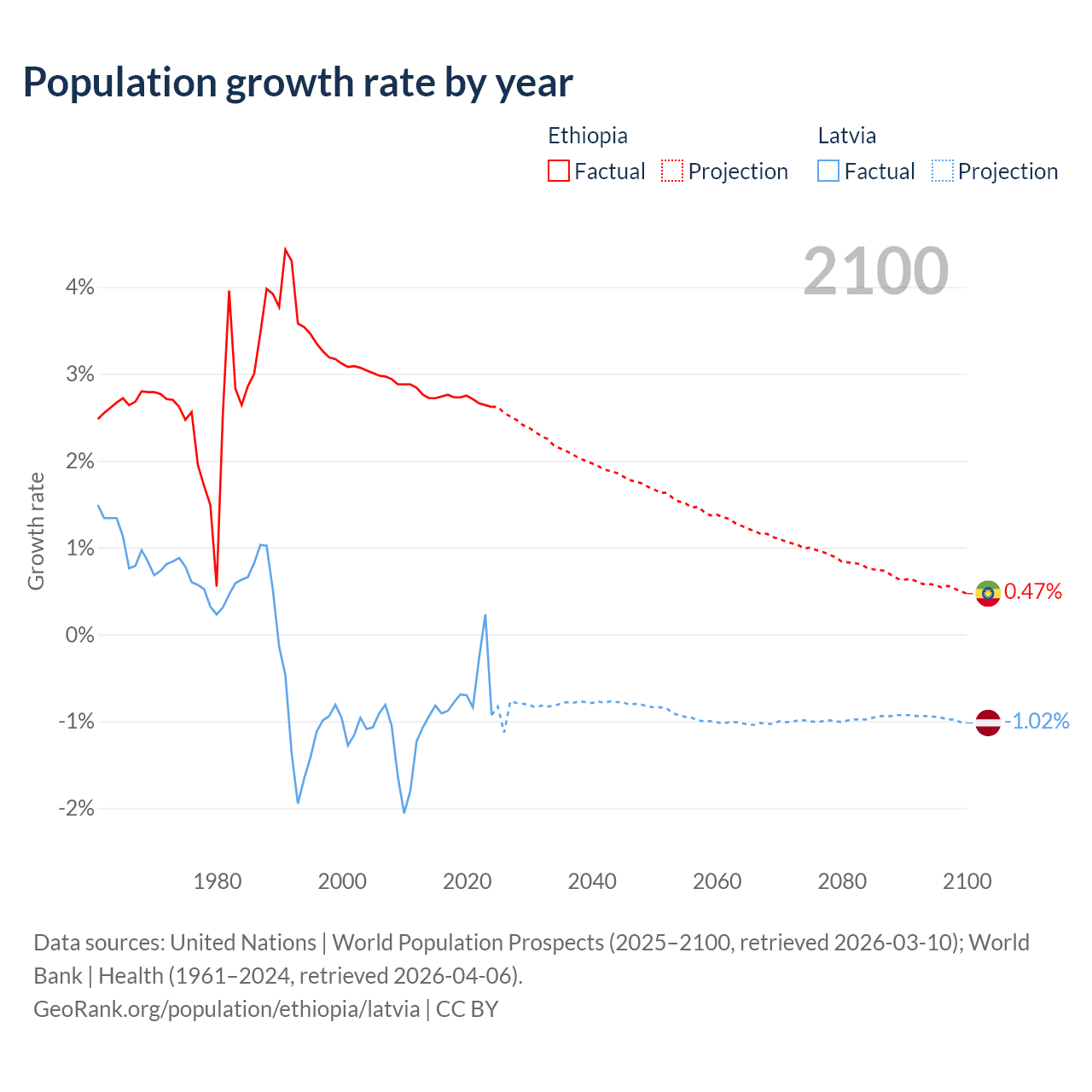 - For the last 10 years, Ethiopia has had an average growth rate of +2.71% per year vs -0.68% in Latvia.