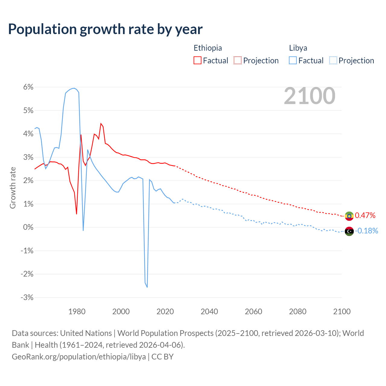- For the last 10 years, Ethiopia has had an average growth rate of +2.71% per year vs +1.44% in Libya.