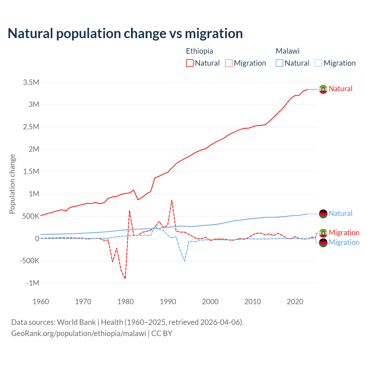 Over the last 10 years, 98.8% of the population change in Ethiopia is from natural causes (a gain of 30,237,373 people) and 1.19% is from migration (a gain of 365,488 people). In Malawi 99.3% is from natural causes (a gain of 5,019,393 people) and 0.67% is from migration (a loss of 33,768 people).