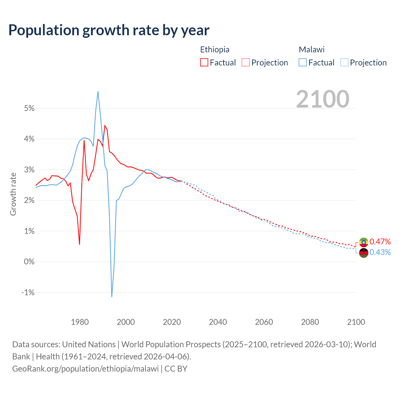 - For the last 10 years, Ethiopia has had an average growth rate of +2.71% per year vs +2.7% in Malawi.