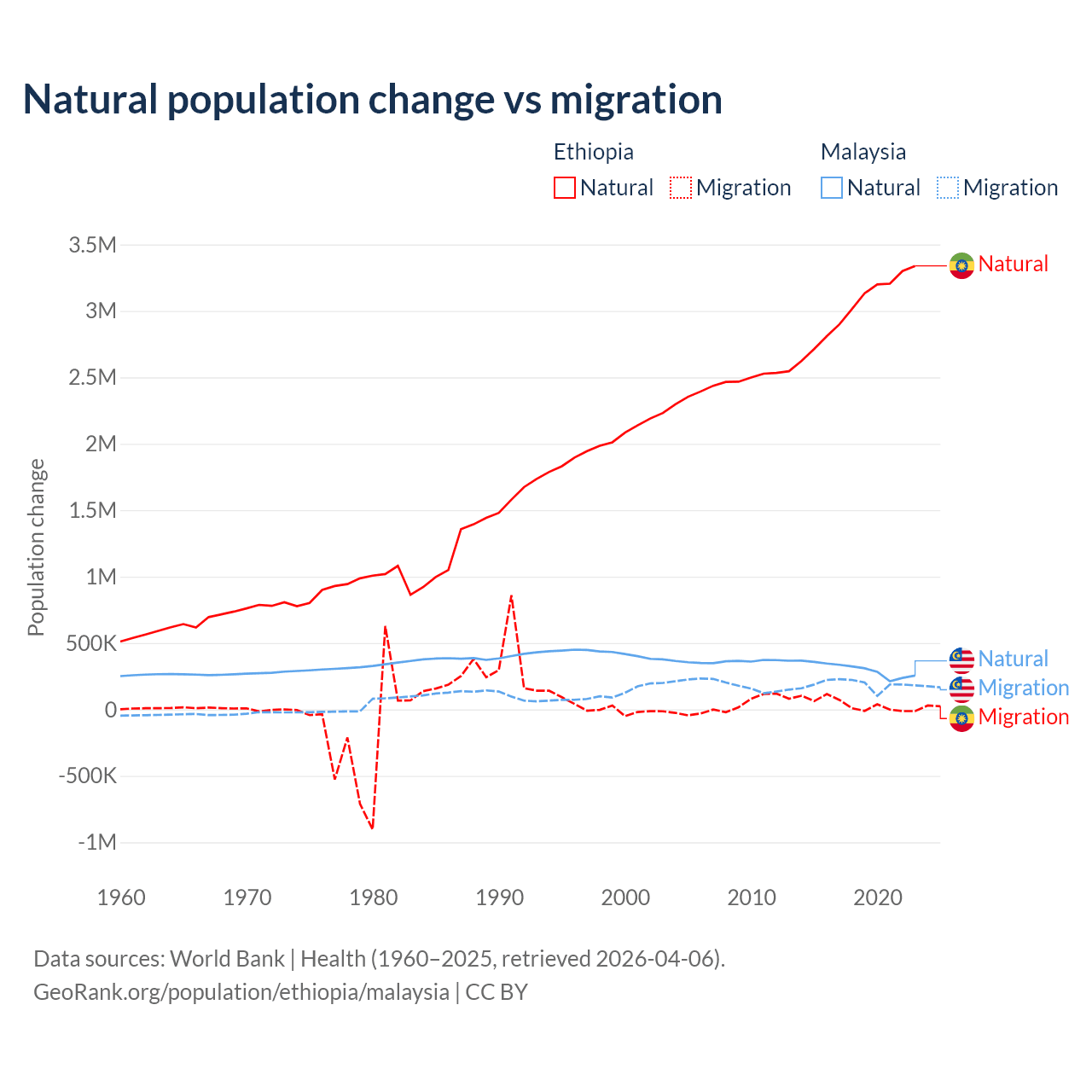 Over the last 10 years, 98.8% of the population change in Ethiopia is from natural causes (a gain of 30,237,373 people) and 1.19% is from migration (a gain of 365,488 people). In Malaysia 61.7% is from natural causes (a gain of 3,029,648 people) and 38.3% is from migration (a gain of 1,882,159 people).