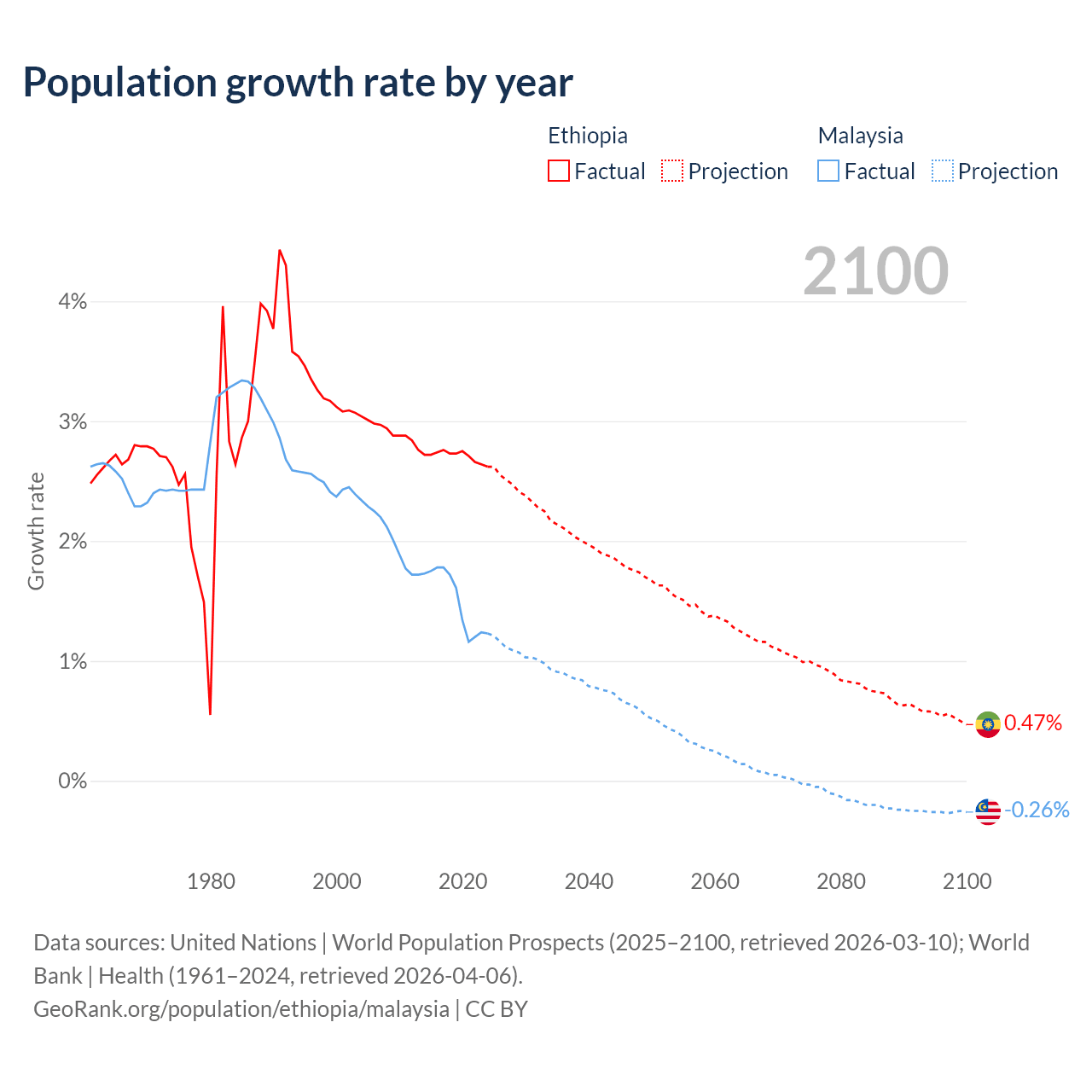 - For the last 10 years, Ethiopia has had an average growth rate of +2.71% per year vs +1.5% in Malaysia.