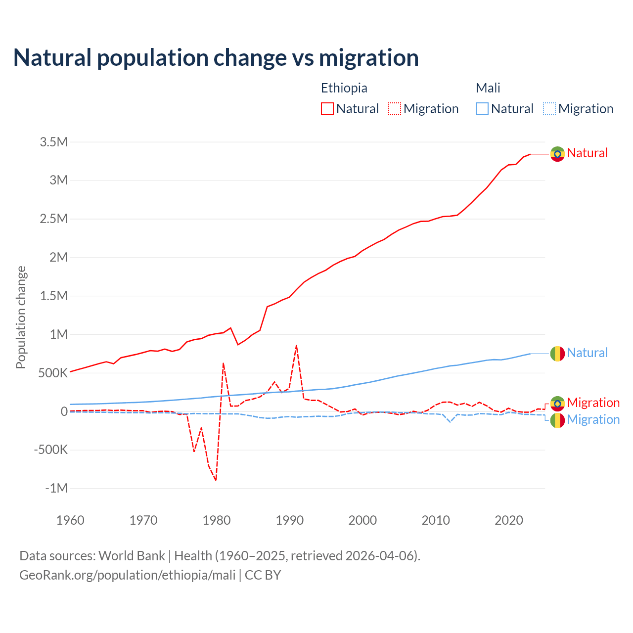Over the last 10 years, 98.8% of the population change in Ethiopia is from natural causes (a gain of 30,237,373 people) and 1.19% is from migration (a gain of 365,488 people). In Mali 94.9% is from natural causes (a gain of 6,749,473 people) and 5.13% is from migration (a loss of 365,292 people).