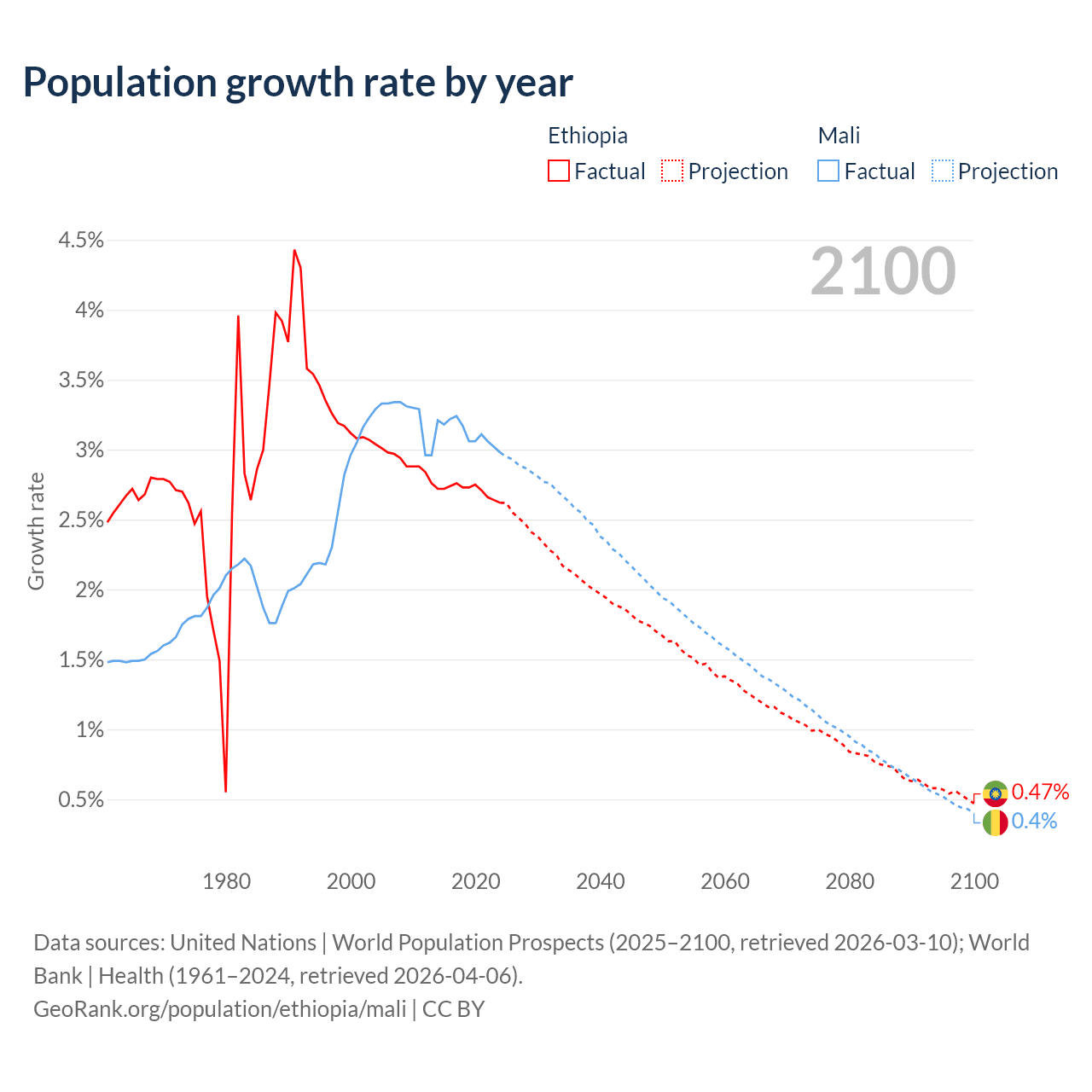 - For the last 10 years, Ethiopia has had an average growth rate of +2.71% per year vs +3.12% in Mali.