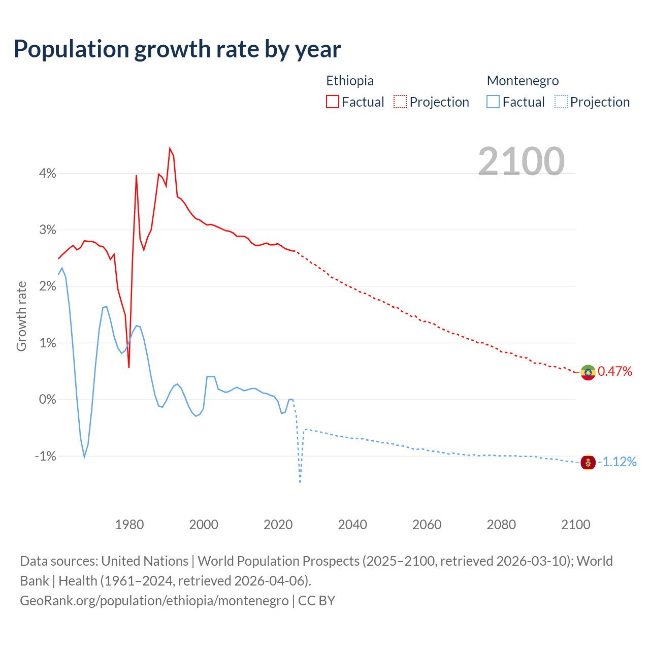- For the last 10 years, Ethiopia has had an average growth rate of +2.71% per year vs +0.01% in Montenegro.