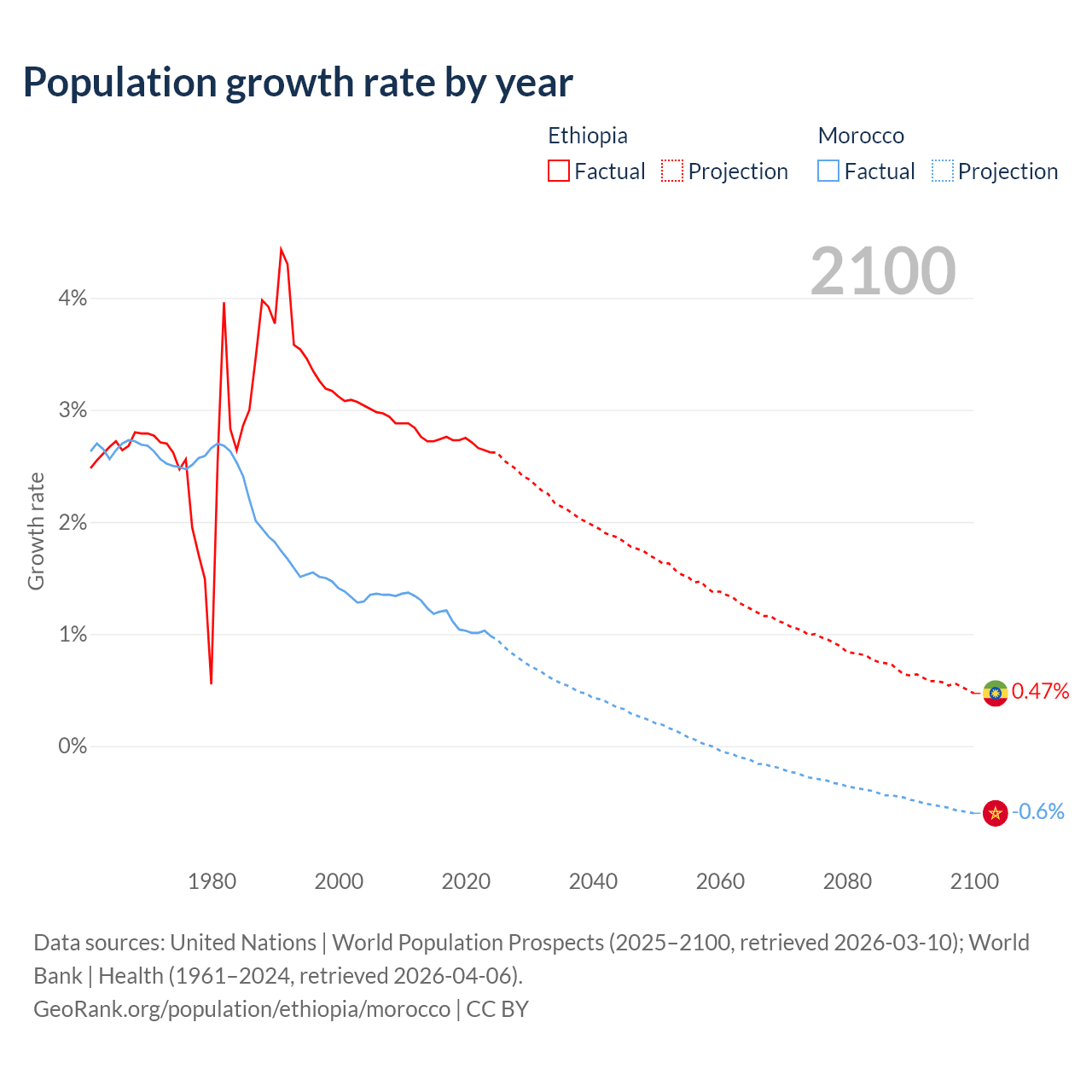 - For the last 10 years, Ethiopia has had an average growth rate of +2.71% per year vs +1.09% in Morocco.