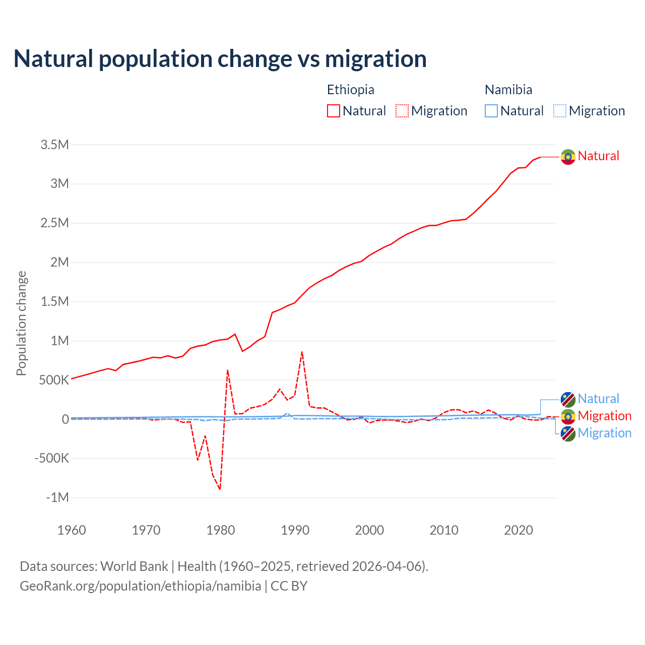 Over the last 10 years, 98.8% of the population change in Ethiopia is from natural causes (a gain of 30,237,373 people) and 1.19% is from migration (a gain of 365,488 people). In Namibia 74.3% is from natural causes (a gain of 532,532 people) and 25.7% is from migration (a gain of 183,837 people).