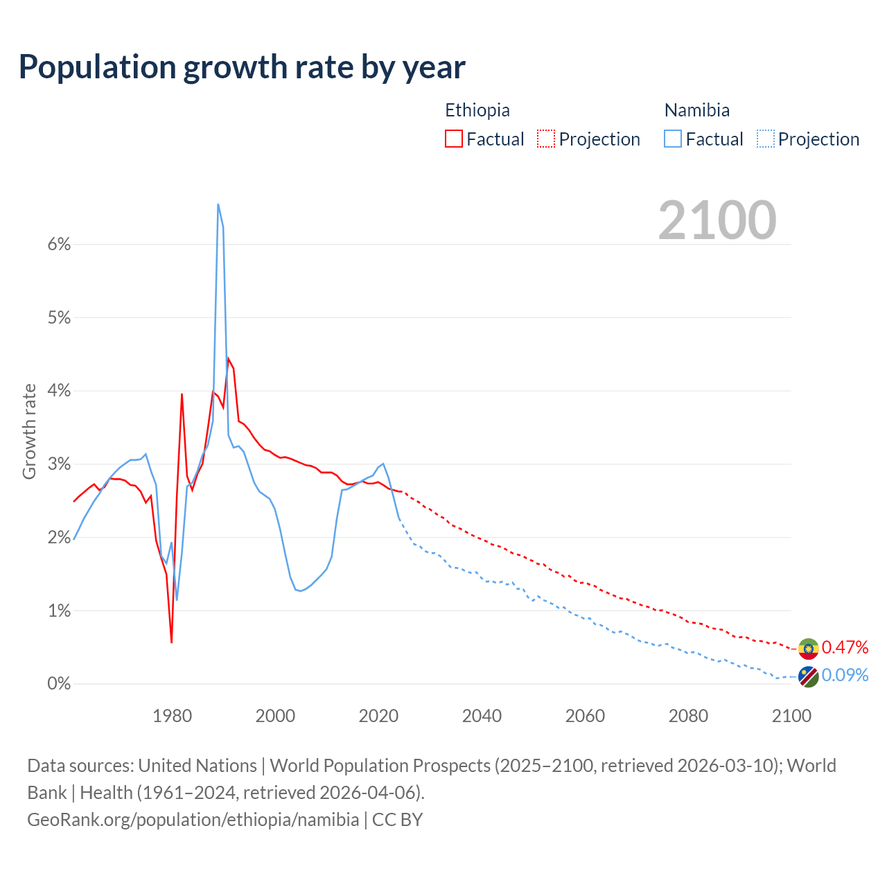 Data sources: World Bank | Health (1960–2024, retrieved 2026-04-06); United Nations | World Population Prospects (1960–2026, retrieved 2026-03-10); U.S. Census Bureau (1960–2025, retrieved 2026-02-08); Central Intelligence Agency (CIA) (2000–2019, retrieved 2026-02-20).