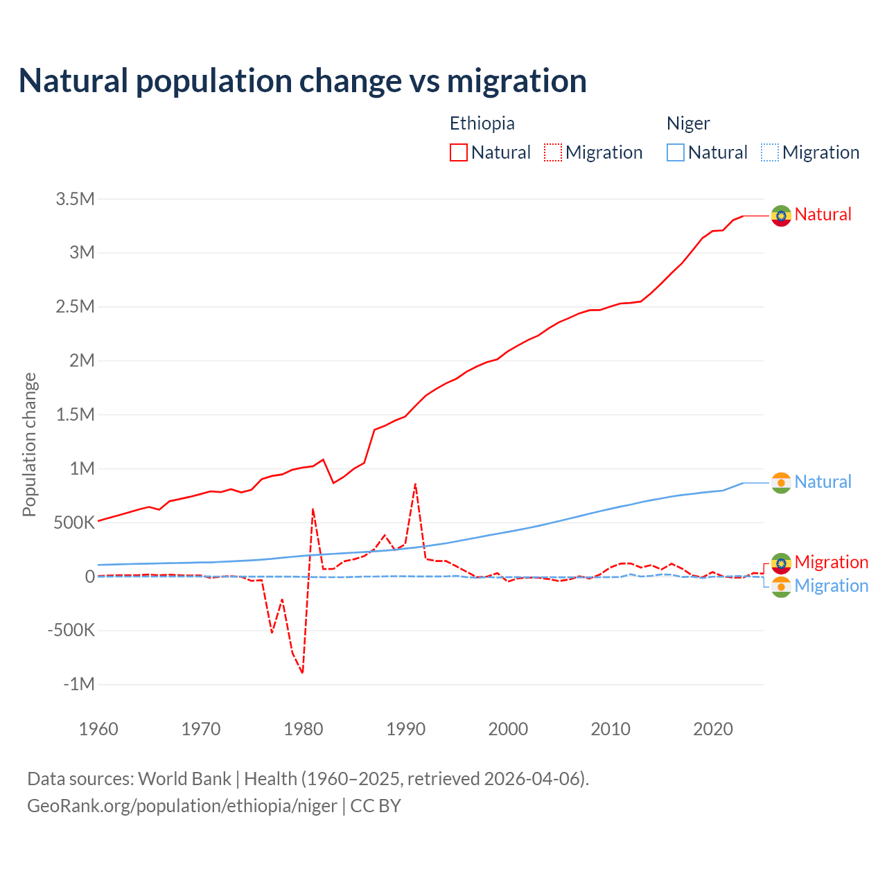 Over the last 10 years, 98.8% of the population change in Ethiopia is from natural causes (a gain of 30,237,373 people) and 1.19% is from migration (a gain of 365,488 people). In Niger 100% is from natural causes (a gain of 7,728,287 people) and 0.03% is from migration (a gain of 2,520 people).