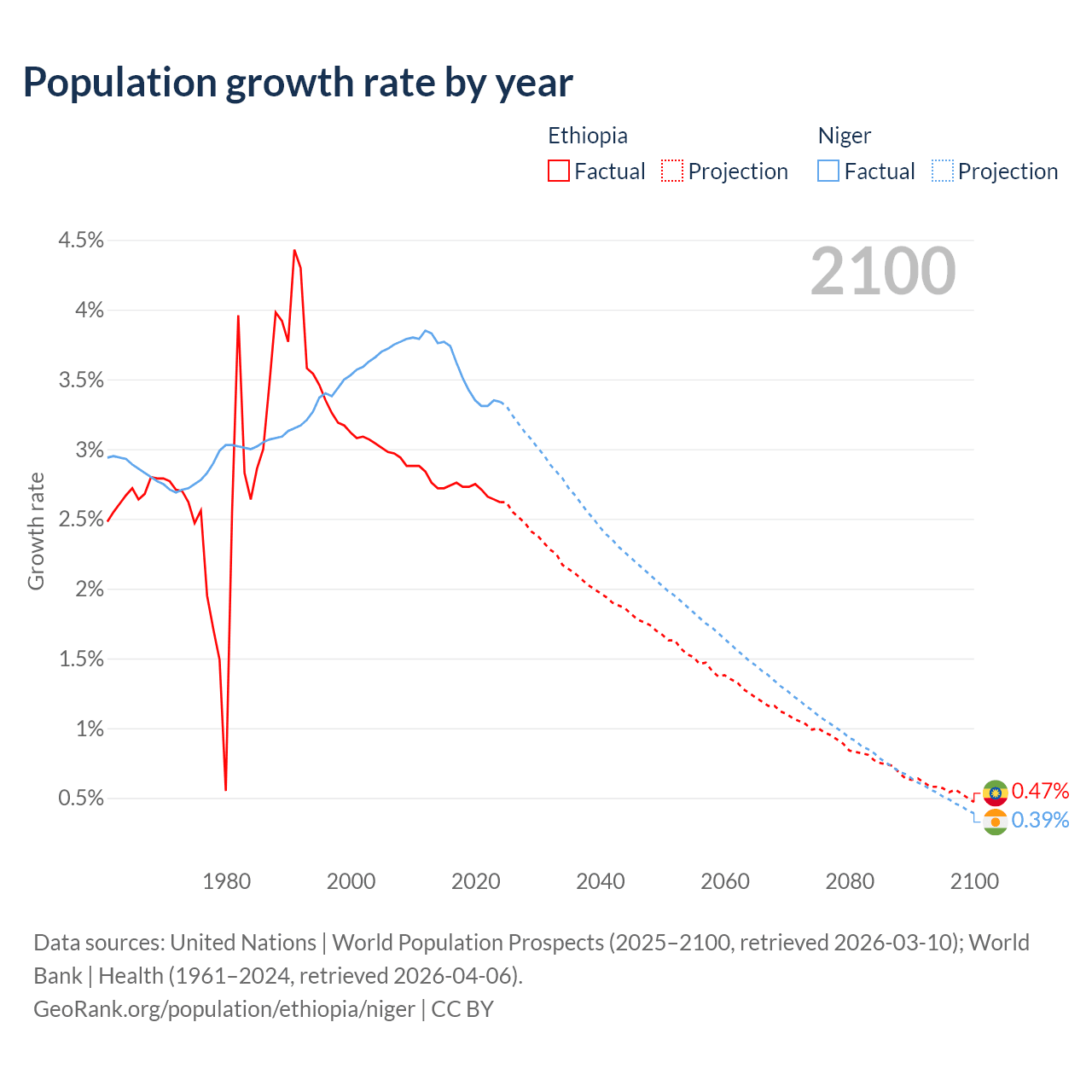 - For the last 10 years, Ethiopia has had an average growth rate of +2.71% per year vs +3.5% in Niger.