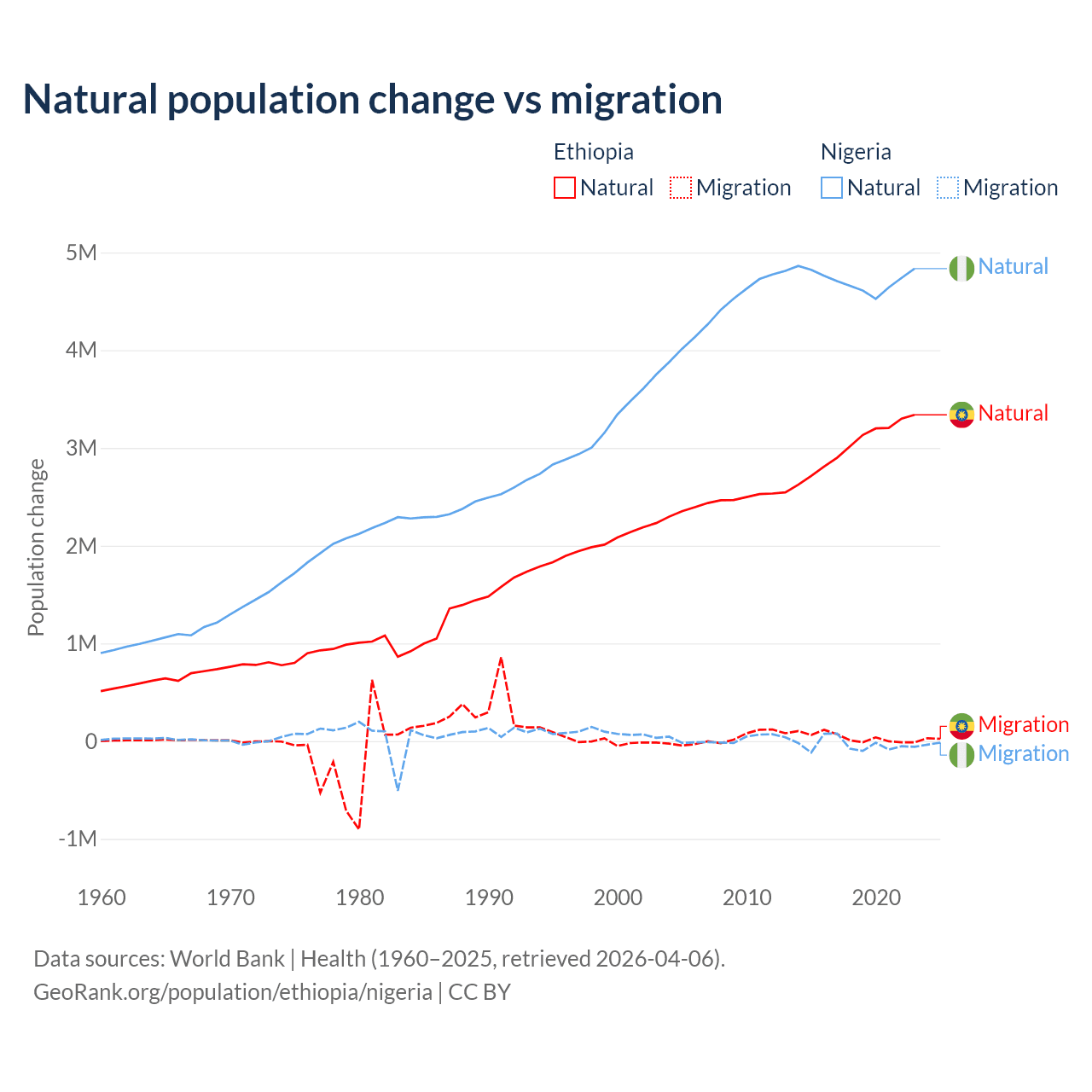 Over the last 10 years, 98.8% of the population change in Ethiopia is from natural causes (a gain of 30,237,373 people) and 1.19% is from migration (a gain of 365,488 people). In Nigeria 99.2% is from natural causes (a gain of 47,163,517 people) and 0.77% is from migration (a loss of 368,103 people).