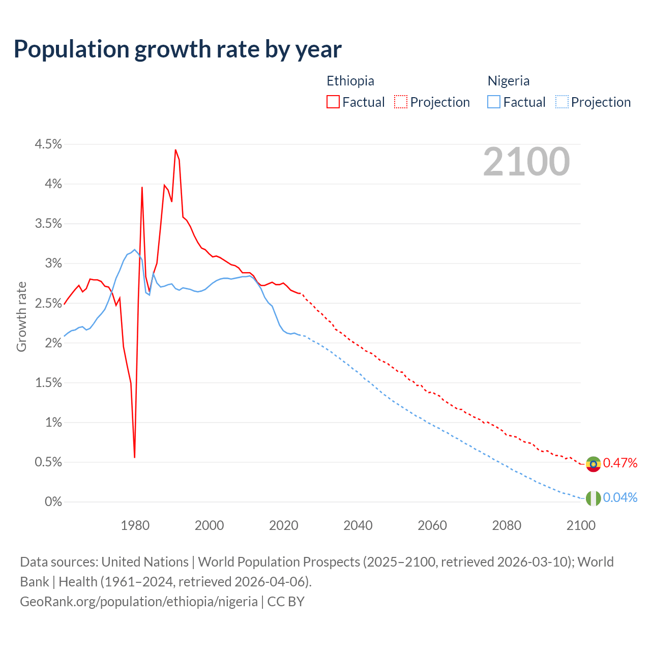 - For the last 10 years, Ethiopia has had an average growth rate of +2.71% per year vs +2.31% in Nigeria.
