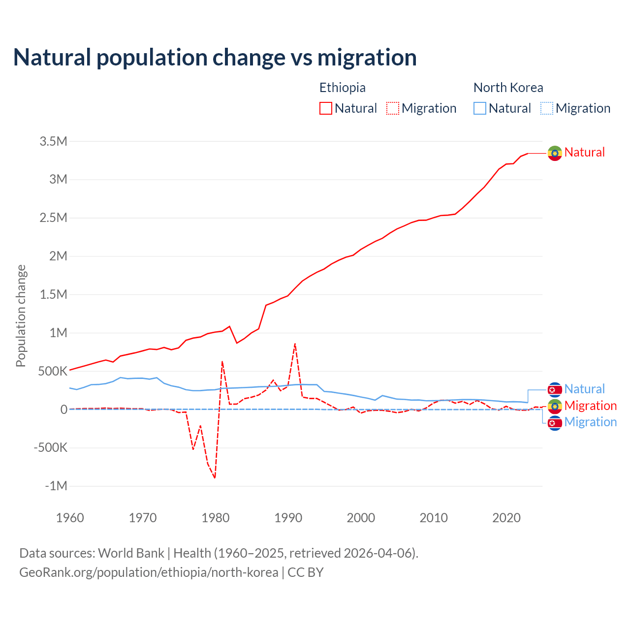 Over the last 10 years, 98.8% of the population change in Ethiopia is from natural causes (a gain of 30,237,373 people) and 1.19% is from migration (a gain of 365,488 people). In North Korea 97.7% is from natural causes (a gain of 1,097,372 people) and 2.33% is from migration (a loss of 26,227 people).