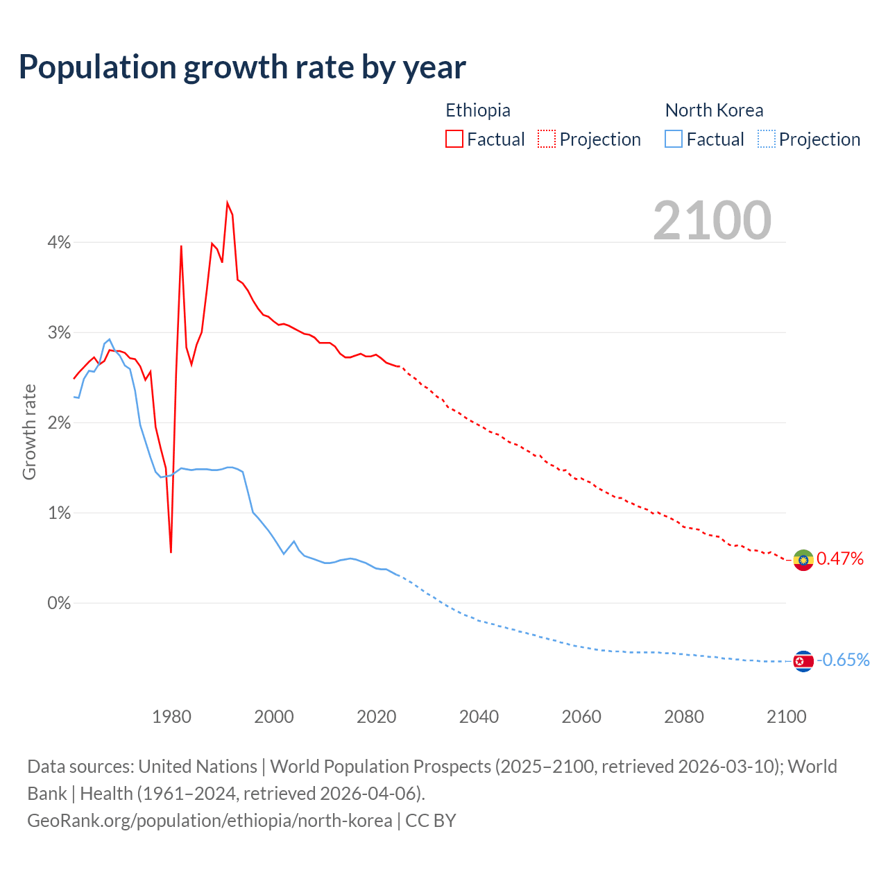 - For the last 10 years, Ethiopia has had an average growth rate of +2.71% per year vs +0.41% in North Korea.