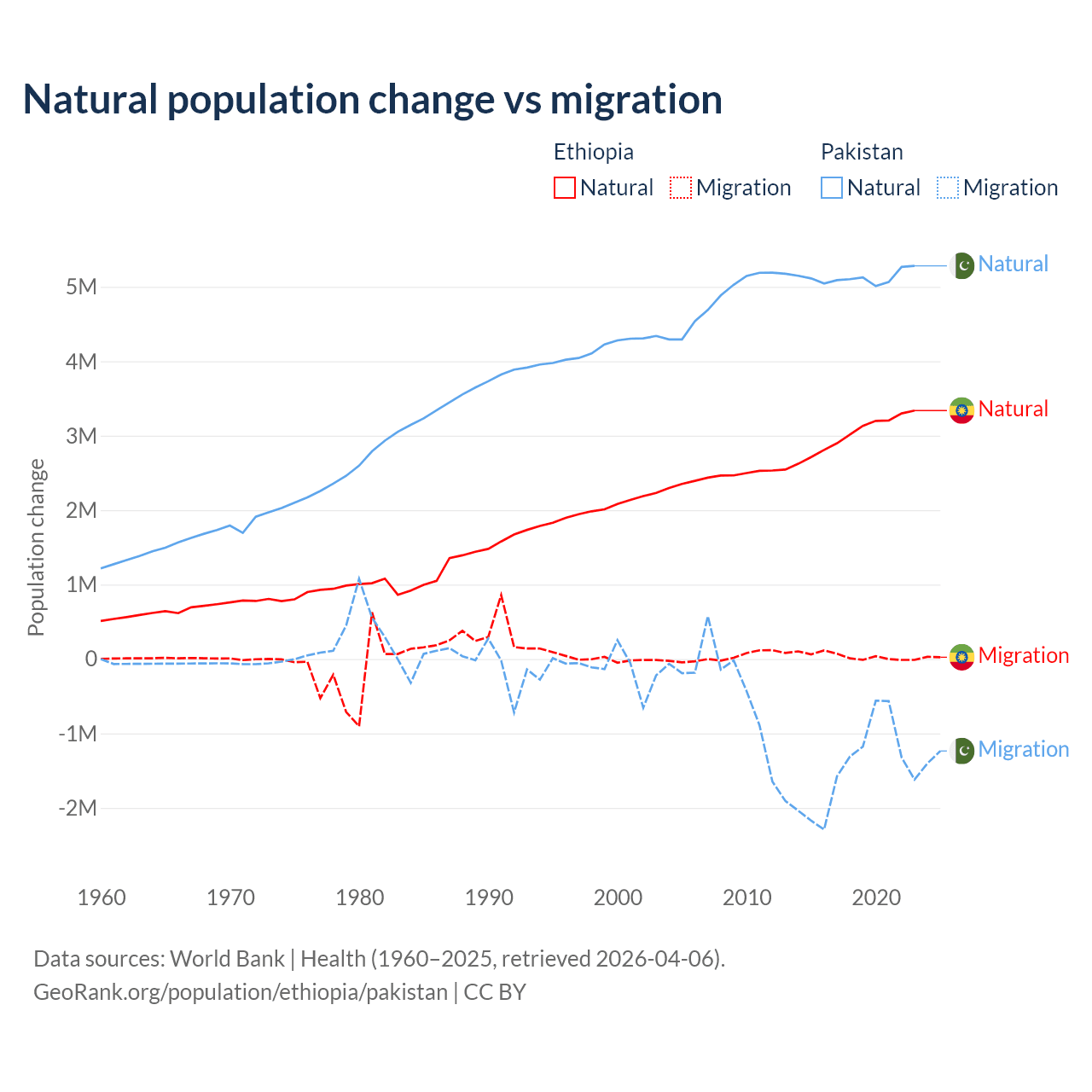 Over the last 10 years, 98.8% of the population change in Ethiopia is from natural causes (a gain of 30,237,373 people) and 1.19% is from migration (a gain of 365,488 people). In Pakistan 77.8% is from natural causes (a gain of 51,255,404 people) and 22.2% is from migration (a loss of 14,629,055 people).