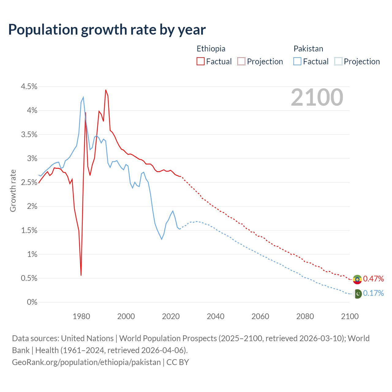 - For the last 10 years, Ethiopia has had an average growth rate of +2.71% per year vs +1.6% in Pakistan.