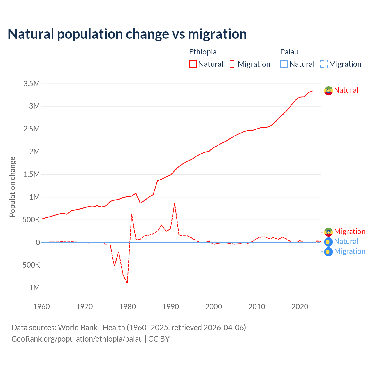 Over the last 10 years, 98.8% of the population change in Ethiopia is from natural causes (a gain of 30,237,373 people) and 1.19% is from migration (a gain of 365,488 people). In Palau 53.8% is from natural causes (a gain of 264 people) and 46.2% is from migration (a loss of 227 people).