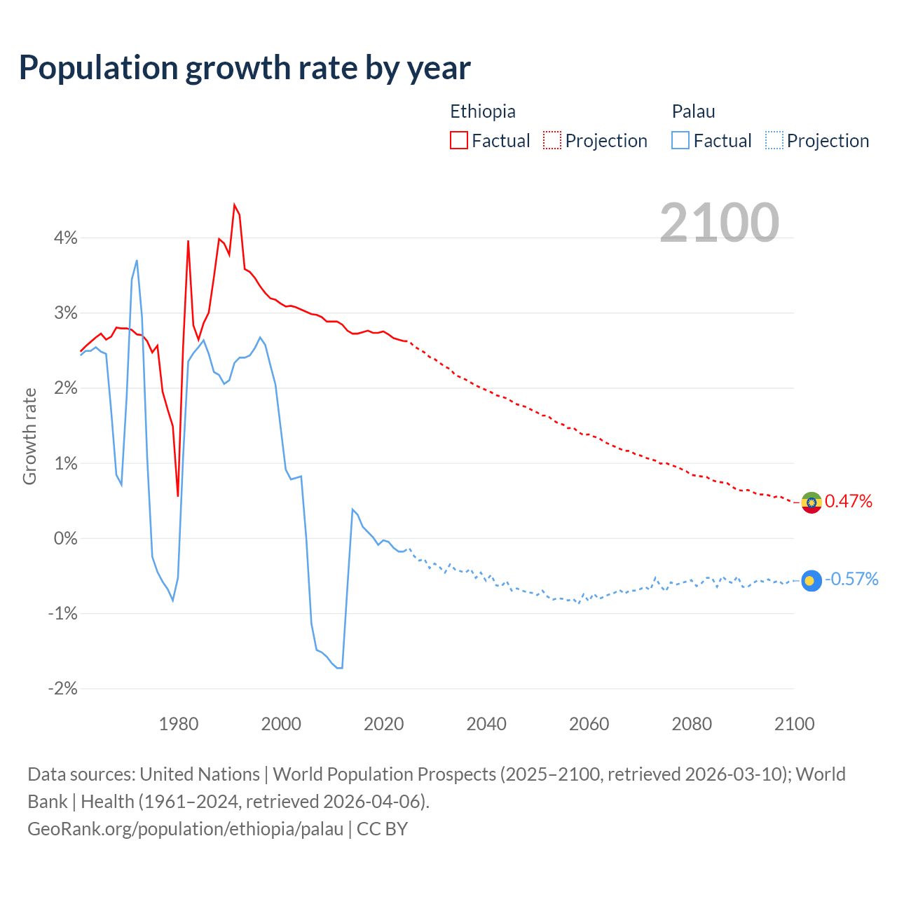 - For the last 10 years, Ethiopia has had an average growth rate of +2.71% per year vs +0.02% in Palau.