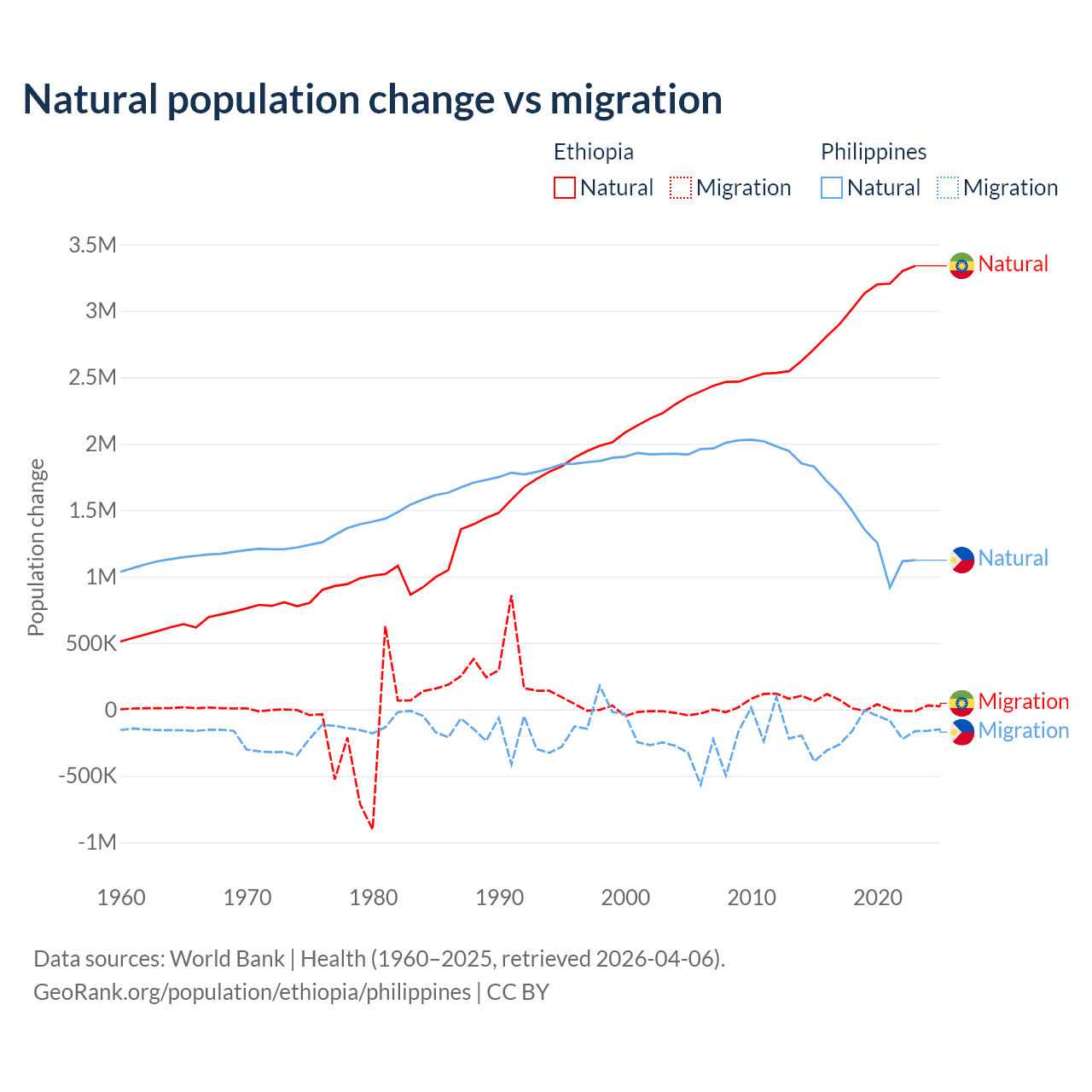 Over the last 10 years, 98.8% of the population change in Ethiopia is from natural causes (a gain of 30,237,373 people) and 1.19% is from migration (a gain of 365,488 people). In the Philippines 88.5% is from natural causes (a gain of 14,279,705 people) and 11.5% is from migration (a loss of 1,848,117 people).